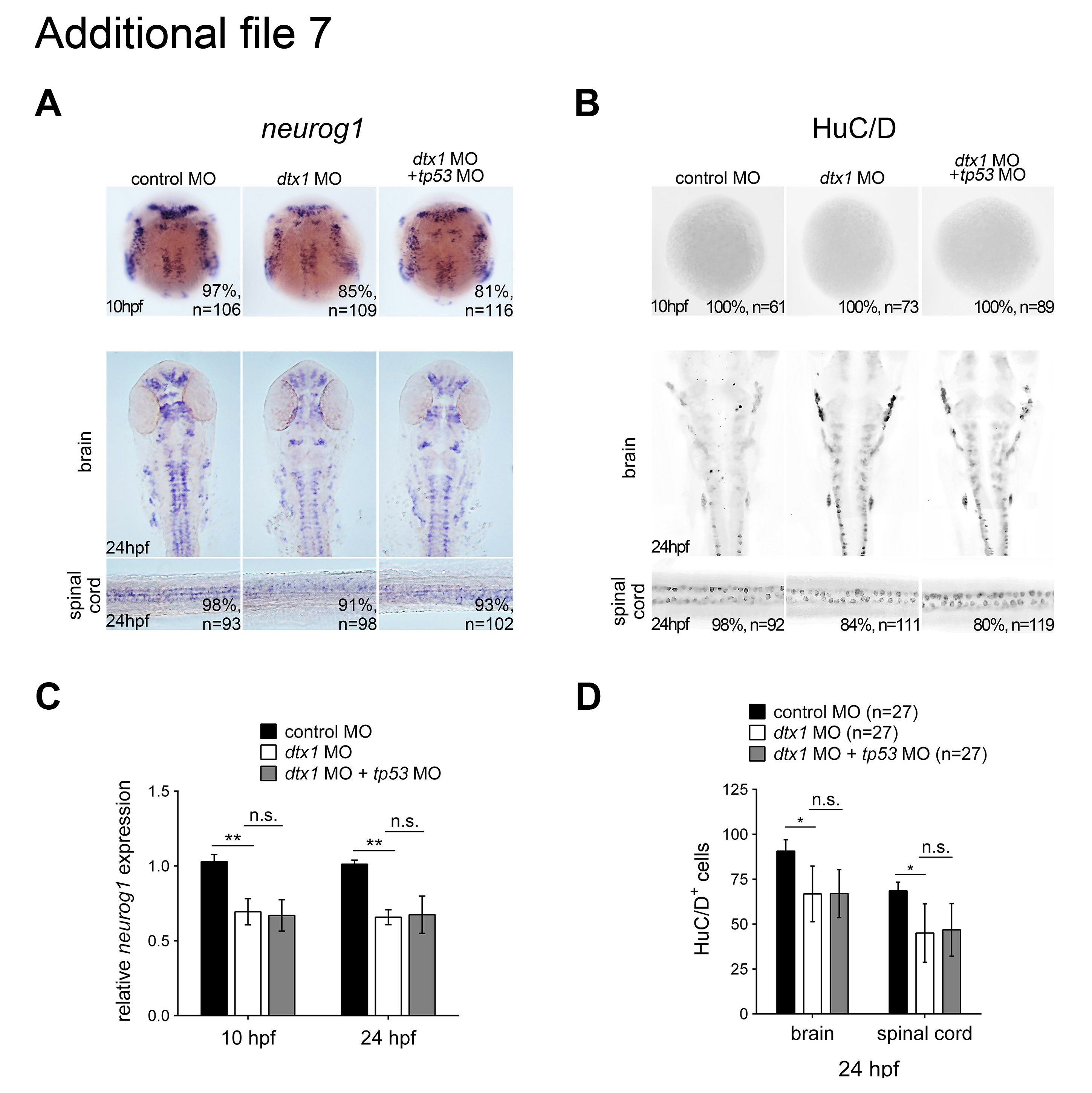 Fig. S7 Phenotypes of Dtx1 morphants were not caused by nonspecific p53 activation. Embryos coinjected with dtx1 MO and tp53 MO were compared with Dtx1 morphants, and we observed no detectable deviation from all markers tested. Compared with the controls, the injection of tp53 MO alone did not show any significant alterations, as shown by in situ hybridization (a), immunohistochemistry (b), qPCR (c), and cell count (D).*, P < 0.05; **, P < 0.01; n.s., nonsignificant.