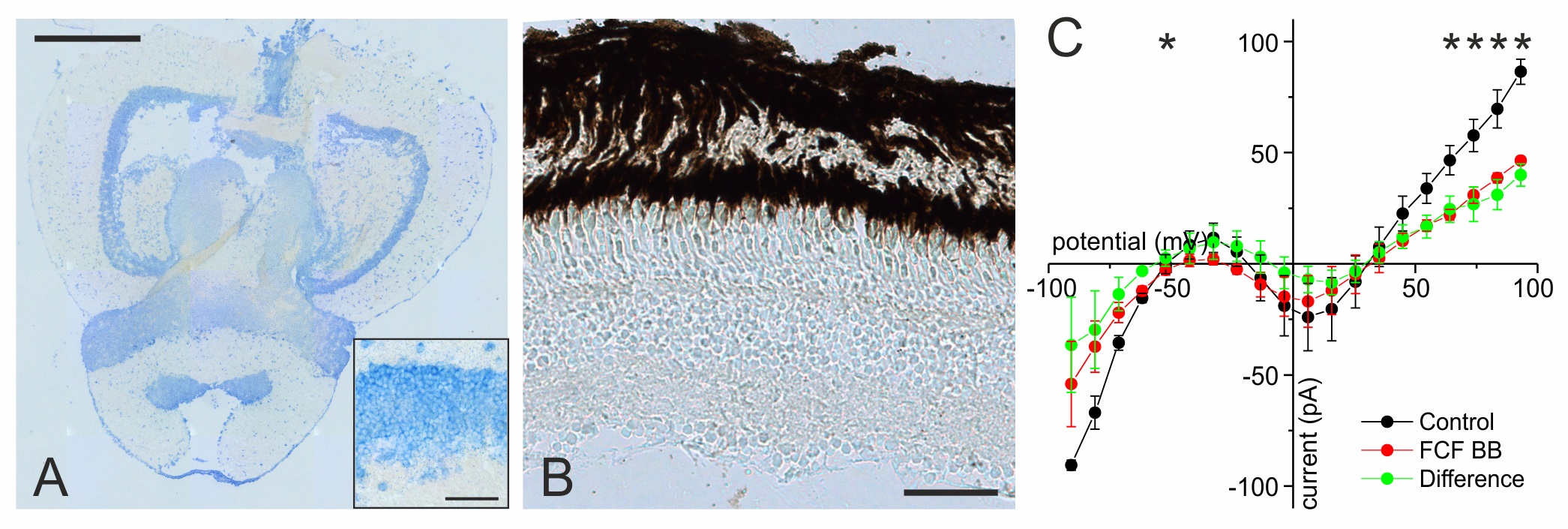To rule out possible other effects of probenecid than inhibiting Panx1, we investigated the presence of organic anion transporters (OATs) in the retina. The only other proteins known to be inhibited by probenecid are OATs [67]. OAT1 is expressed in the brain [68], but retinal expression in fish has not been assessed. To test whether this transporter is also expressed in the retina, we performed an in situ hybridization (ISH) experiment. Here we show with ISH of a probe directed to OAT1 that the OAT1 was expressed in various places in the brain. (A) Horizontal slice through the zebrafish brain at the level of the telencephalon and mesencephalon. The blue reaction product is widely present. Note for instance the restricted presence of reaction product in a layer in the tectum opticum. Scale bar, 500 µm. Images were acquired with a 20× objective and an Evolution MP Color camera (Media Cybernetics, Rockville, USA) connected to an Axioskop light microscope (Zeiss, Göttingen, Germany) and stitched together with Image Pro 6.3. The insert in panel (A) shows that the label is exclusively present in the cellular compartments. Scale bar for the insert is 25 µm. No reaction product was found in the inner and outer nuclear and ganglion cell layers of the zebrafish retina (B). Scale bar, 50 µm. Thus, probenecid can be considered a specific Panx1 inhibitor in the retina, as its actions are not mediated via an OAT1 pathway. (C) The mean whole-cell IV relations of four dissociated HCs in control conditions (black) and when the Panx1 current was blocked with 20 µM BB FCF (red). During the whole experiment, potassium currents were inhibited by Cs. The green trace is the IV relation of the BB FCF blocked current. This current has the similar characteristics as the Panx1 current described by Prochnow et al. [11]. Both (B) and Figure S3C demonstrate current flows via Panx1 channels within the physiological membrane potential range. Methods ISH: Zebrafish brain and eyes were isolated and fixed in 4% formalin solution for 2 h, treated with a sucrose solution to prevent ice crystal formation in storage, and fixed for another 24 h in 25% paraformaldehyde (PFA). The tissue was embedded in Tissue-Tek and frozen. Cryostat sections of 10 µm were collected with a Leica CM 3050 S cryostat (Leica Biosystems, USA) and stored at −80°C. For ISH, sections were stored at −80°C. Hybridization was performed using OAT1-specific, 5′-fluorescein-labeled 25 mer antisense oligonucleotides containing locked nucleic acid (LNA) (base uppercase) and 2′-O-methyl (2OME)-RNA moieties (base lowercase); OAT1-1 (5′-Fam/TagTagGcaAagCtgGtgCtgGagA-3′). Probes were synthesized by Exiqon (Odense, Denmark). Hybridization signals were detected by incubating the sections in blocking buffer containing anti-fluorescein-alkaline phosphatase (AP) Fab fragments (1∶1,000; Roche, Lewes, UK) for 1 h at room temperature. AP signal was detected by using a substrate kit (Vector Blue AP Substrate Kit III; Vector, Burlingame, CA).