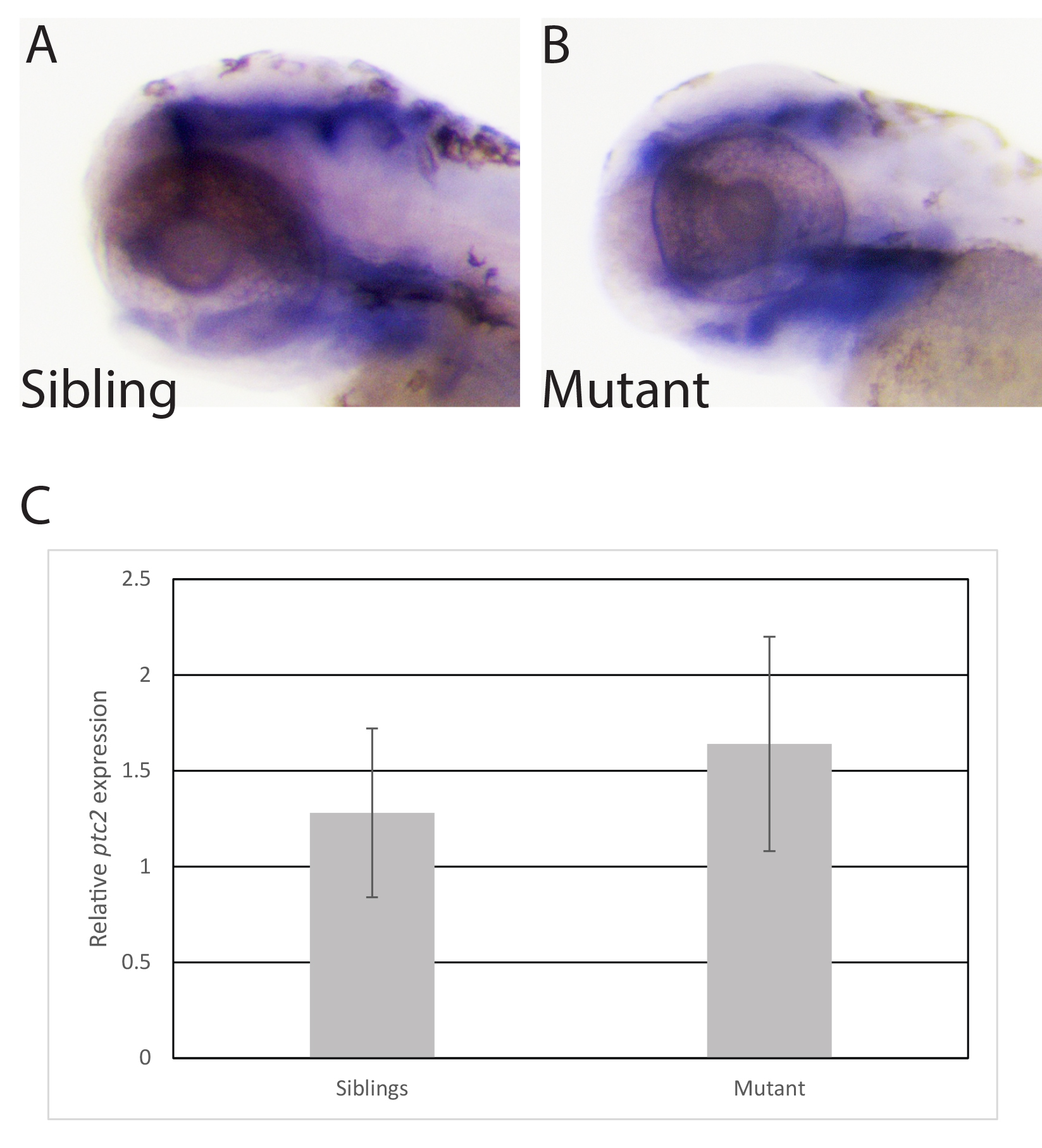 A-B. Whole mount in situ hybridization was performed on wildtype and mutant siblings at 3 days post fertilization/protruding mouth stage to detect the expression of ptch2. n = 47 including 17 wildtype, 7 homozygous mutants, and 23 heterozygous mutants. C. Real time PCR was performed on a pool (n = 20) of siblings or hmgcs1 mutant embryos at 4 days post fertilization to detect ptch2 expression (ptc2). Error bars demonstrate the standard error of the mean across two biological replicates each with 20 embryos per pool.