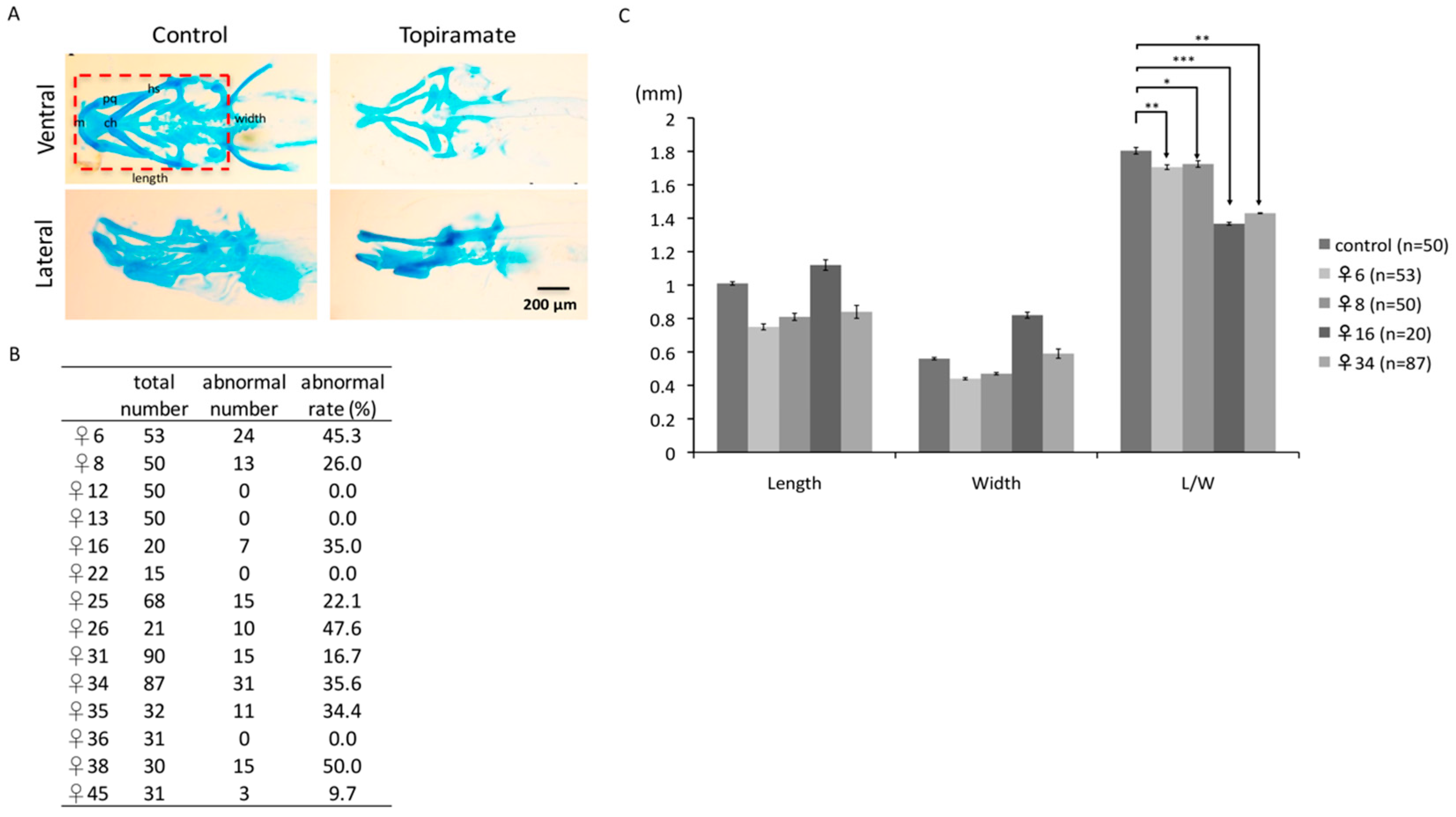 Cartilage development of offspring was impaired through maternal transmission of topiramate. (A) Ventral and lateral views of cartilage structure were detected by Alcian blue staining at 4 dpf larvae. Compared to the control group, there was a lack or shortage of cranial and pharyngeal development in topiramate-treated offspring; (B) embryonic number and abnormal rate were calculated from 14 female zebrafish; (C) length and width from individual maternal fish were measured and statistically analyzed. (averages ± SD; * p < 0.5; ** p < 0.01; *** p < 0.005; cb, ceratobranchial; ch, ceratohyal; ep, ethmoid plate; hs, hyosymplectic; M, Meckel’s cartilage; pq, palatoquadrate; Scale bar: 200 μm).