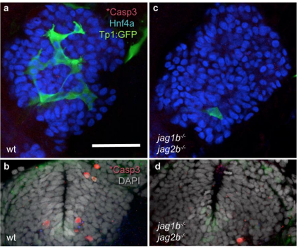 Fig. s5 Supplementary figure 5. Apoptosis does not contribute to the lack of intrahepatic duct cells in jag1b and jag2b double homozygous mutants. (a-d) Whole mount immunofluorescent images of 54 hpf sibling (a,b) and double mutant (c,d) embryos labeled for cleaved Caspase3 (*Casp3) expression. Sibling (a) and double mutant (c) livers labeled for Hnf4a (blue) show no signs of apoptosis based on a lack of cleaved Caspase3 (red) expression or blebs of Tp1:GFP+ (green), whereas the ventral forebrains (b,d, with DAPI channel also shown) of the same embryos (from a,c) show normal apoptosis patterns as indicated by variable presence of cleaved Caspase3 (red). Scale bar 50μM. Representative samples, n= 4 siblings, 4 jag1b-/-;jag2b-/-