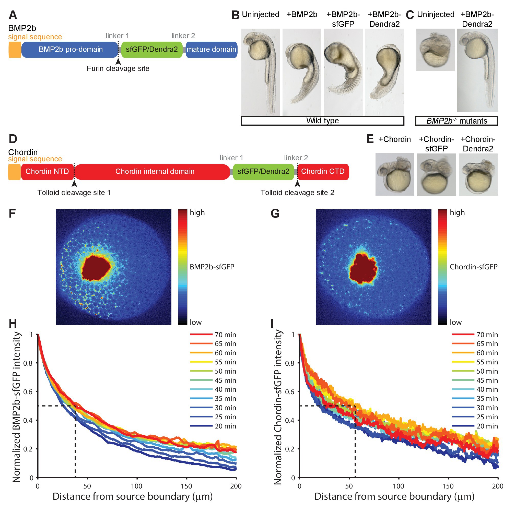 (A) Schematic of BMP2b-sfGFP and -Dendra2 fusion constructs. (B) Fluorescent BMP2b fusion constructs can induce ventralization, a BMP-overexpression phenotype (Kishimoto et al., 1997). mRNA amounts equimolar to 2 pg of BMP2b mRNA were injected at the one-cell stage, and images were taken 30 hr post-fertilization (hpf). (C) Rescue of a BMP2b mutant (swr−/−) with BMP2b-Dendra2. 2.74 pg of BMP2b-Dendra2-encoding mRNA were injected at the one-cell stage, and images were taken at 30 hpf. In a separate experiment with 1 pg of BMP2b-sfGFP-encoding mRNA, 20% (9/44) of all injected swr−/− mutants were rescued, 16% (7/44) were ventralized, and 64% (28/44) were dorsalized. (D) Schematic of Chordin-sfGFP and -Dendra2 fusion constructs. (E) Fluorescent Chordin constructs can induce dorsalization, a Chordin-overexpression phenotype. mRNA amounts equimolar to 30 pg of Chordin mRNA were injected into wild type embryos at the one-cell stage, and images were taken at 30 hpf. F + G) Light sheet microscopy images of BMP- and Chordin-sfGFP gradients forming from a local source in live zebrafish embryos. Approximately 50–75 cells expressing BMP2b-sfGFP (F) or Chordin-sfGFP (G) were transplanted into host embryos at sphere stage (see Materials and methods for details). The images show gradient formation in single optical slices approximately 20 min after transplantation. H + I) Quantification of BMP2b-sfGFP (H) and Chordin-sfGFP (I) gradient formation kinetics from a local source (BMP2b-sfGFP: n = 8; Chordin-sfGFP: n = 5). Dashed lines indicate the distance at which the protein distributions drop to 50% of their maximal concentration 60 min post-transplantation.