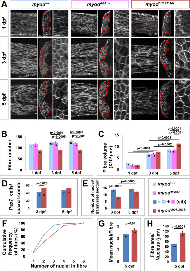Lack of myod alters somite growth. A. Single confocal planes of myodfh261 mutant and sibling zebrafish expressing plasma membrane-GFP from Tg(Ola.Actb:Hsa.HRAS-EGFP)vu119. Individual retrospectively-genotyped larvae are shown at comparable levels in somites 16–18 at successive stages in each tryptich in lateral (left), transverse (centre) and magnified transverse (right) views. The somite is outlined (red dots). Bars 10 µm. B. Fibre number per somite in each stage and genotype as indicated in key. Note that sibling fibre numbers at 1 dpf are higher than those in Fig. 1E, perhaps because sequential live scanning means that ‘1 dpf’ fish are on average ~4 h older than in fixed preparations. C. Mean fibre volume = myotome volume/fibre number. D,E. Larvae from myodfh261 heterozygote incross were stained at 3 and 5 dpf for Pax7, MyHC and DNA and analysed by confocal microscopy. Pax7+ cell number/epaxial somite (D) and number of nuclear profiles within the myotome/transverse optical section of epaxial somite 17 (E) were scored from fish genotyped by loss of head myogenesis. F-H. Analysis of nuclear number in fast fibres of myodfh261 mutant and sibling Tg(Ola.Actb:Hsa.HRAS-EGFP)vu119 injected with RNA encoding H2B-mCherry to permit counting in live larvae. Fibres analysed (number on columns) are shown in Fig. S5. A cumulative frequency plot (F) reveals the larger number of nuclei in fibres of mutants, which is reflected in an average of 16% increase in nuclear number (G) accompanied by a 63% increase in fibre cross-sectional area per nucleus (H), reflecting an 80% increase in fibre size. Differences tested by ANOVA with Tukey post-hoc (B,C), Kruskall-Wallis (F,G) and t-test (E,H).