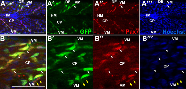 pax7a:GFP+ cells co-express Pax7. Wholemount 3.25 dpf pax7a:GFP;pfe/pfe larvae in lateral view with dorsal up and anterior to left after immunodetection of GFP and Pax7, and counterstaining with Hoechst 33342. Single deep confocal slices of two whole somites (A) and epaxial somite (B) are shown. GFP largely co-localizes with Pax7 (white arrows). Pax7+ cell on VM that is not GFP+ (yellow arrows). Scale bars = 50 µm.