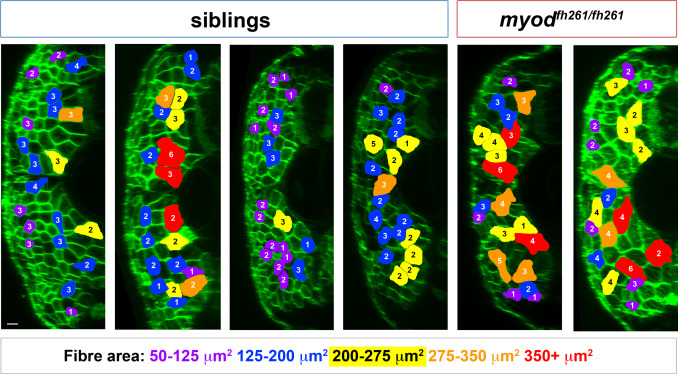Nuclear counts and size measurement of fast fibres. Transverse views of wholemount 5 dpf larvae from an incross of myodfh261/+;Tg(Ola.Actb:Hsa.HRAS-EGFP)vu119 injected at 1 cell stage with RNA encoding H2B-mCherry (similar to Addgene #20972, red channel not shown). At 5 dpf, fully dual-labelled larvae were scanned in 3D confocal stacks and retrospectively genotyped. Coloured fibres indicate those selected for measurement using the criteria of a) unambiguously delineation of plasma membrane and nuclei and b) distribution throughout the fast myotome of somite 17. The cross-sectional area at the anteroposterior midpoint of each fibre was measured using Volocity v6.3 and the number of nuclei counted manually in twenty fibres in each fish. Note that fibre outline does not perfectly match the shape of fibre because the midpoints of most fibres are in different planes. Size of fibre is colour coded and nuclear number indicated on each fibre. Data for all sibling (80) and all mutant (40) fibres were pooled and presented in Fig. 6F-H. Scale bar = 10 µm.
