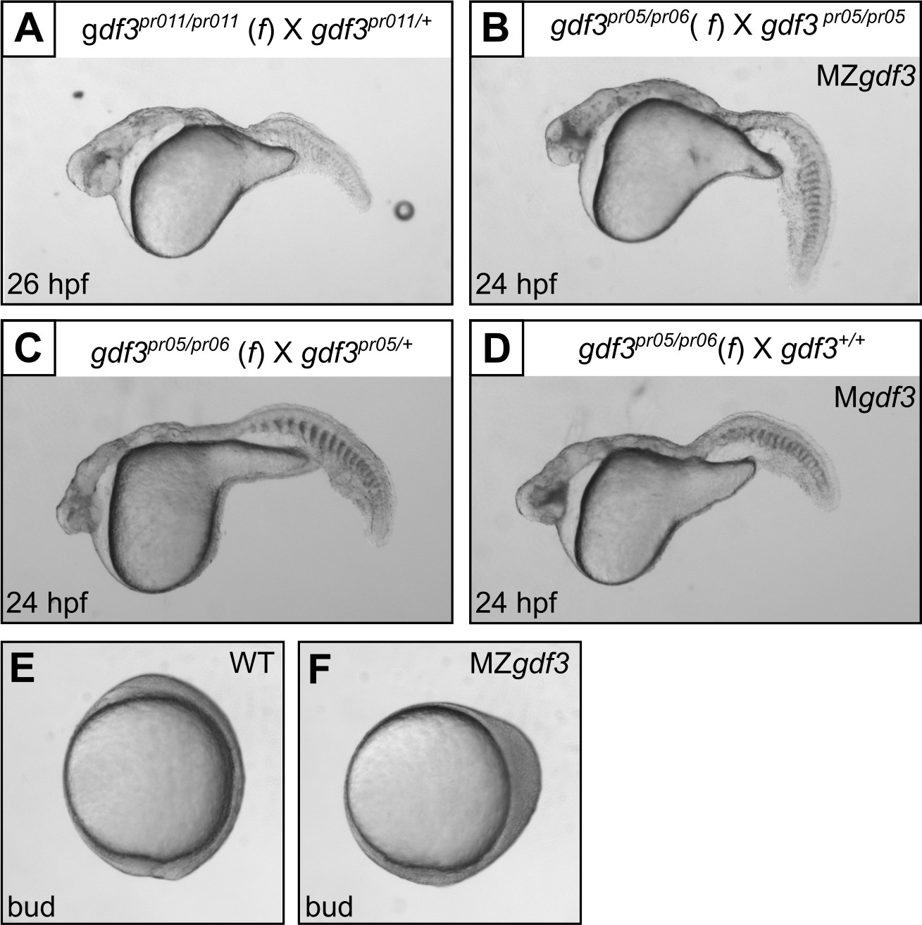 (A) Embryos from maternal homozygotes for pr11 phenocopied pr5 Mgdf and MZgdf embryos. (B-D) Embryos from maternal compound heterozygotes of the pr05 and pr06 alleles were phenotypic, demonstrating lack of complementation between the alleles. (E) Wild-type (WT) embryo at bud stage. (F) MZgdf3 embryos show abnormal development at the bud stage, with a 90 degree shift of anterior structures vegetally; a phenotype similar to that reported for MZtdgf1 embryos (Gritsman et al., 1999). All views are lateral.
