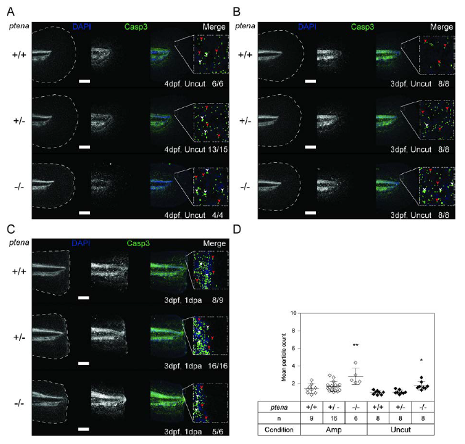 Enhanced apoptosis in the caudal fin-folds of Pten deficient embryos. (A) Uncut embryos from a ptena+/-ptenb-/- in-cross were fixed at 4dpf (4dpf, uncut) in parallel to the embryos depicted in Fig. 6A. (B, C) Embryos from a ptena+/-ptenb-/- in-cross were amputated and fixed at 1dpa (i.e. 3dpf, 1dpa) , equivalent uncut controls (3dpf, uncut) were included. Embryos were subjected to whole-mount immunohistochemistry using an antibody specific for the apoptosis marker activated Caspase-3 (green). The embryos were counterstained with DAPI (blue). Representative images of embryo caudal fin-folds are shown, and in the left panels the edge of the fin-fold is indicated with a dashed line. Number of embryos showing similar patterns/ total number of embryos analysed is indicated in the bottom right corner. The scale bar represents 100μm. Zoom-in images of each caudal fin-fold are shown. White arrowheads indicate cells; red arrowheads indicate background staining. (D) Caspase-3 immunofluorescence was quantified by mean particle count of the caudal fin-fold following thresholding and size restriction to reduce background signal. Means within amputated or uncut groups are compared to ptena+/+ptenb-/- embryos. The number of embryos analysed is indicated (n). Significance: * p<0.05; ** p<0.01; error bars represent standard deviation. Quantification of Caspase-3 immunofluorescence at 4dpf is depicted in Fig. 6B.