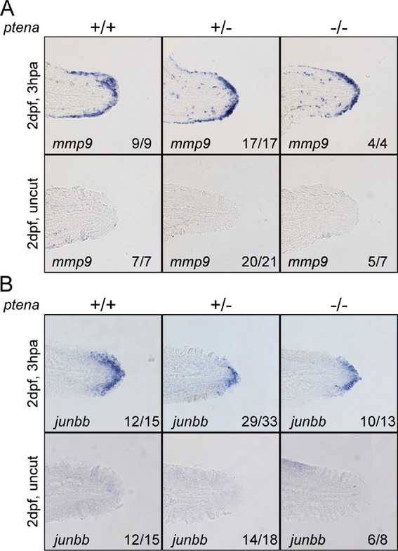 Blastema formation in Pten deficient embryos. At 2 dpf the caudal fin‐fold of embryos from a ptena+/−ptenb−/− in‐cross was amputated and allowed to regenerate. Embryos were fixed at 3 hpa, or equivalent for uncut controls, and subjected to in situ hybridization for mmp9 (A) or junbb (B). Representative images of embryo caudal fin‐folds are shown, and the number of embryos showing similar patterns/total number of embryos analyzed is indicated in the bottom right corner of each panel