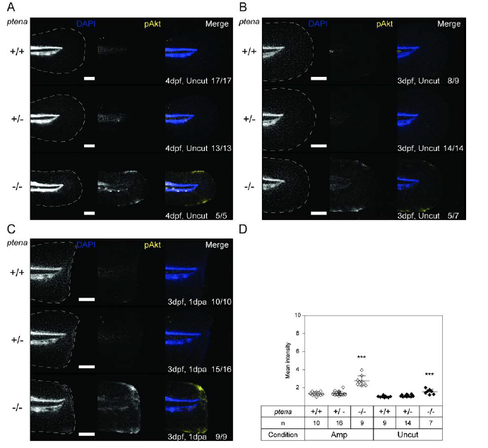 Elevated p-AKT in the caudal fin-folds of Pten deficient embryos. (A) Uncut embryos from a ptena+/-ptenb-/- in-cross were fixed at 4dpf (4dpf, uncut) in parallel to the embryos depicted in Fig. 2A. (B, C) Embryos from a ptena+/-ptenb-/- in-cross were amputated and fixed at 1dpa (i.e. 3dpf, 1dpa), equivalent uncut controls (3dpf, uncut) were included. Embryos were subjected to whole-mount immunohistochemistry using a p-AKT-specific antibody (p-S473) (yellow). The embryos were counterstained with DAPI (blue). Representative images of embryo caudal fin-folds are shown, and in the left panels the edge of the fin-fold is indicated with a dashed line. Number of embryos showing similar patterns/ total number of embryos analysed is indicated in the bottom right corner. The scale bar represents 100μm. (D) p-AKT immunofluorescence was quantified by mean intensity of the region between the notochord and the edge of the caudal fin-fold. Means within amputated or uncut groups are compared to ptena+/+ptenb-/- embryos. The number of embryos analysed is indicated (n). Significance: *** p<0.001; error bars represent standard deviation. Quantification of p-AKT immunofluorescence at 4dpf is depicted in Fig. 2B.