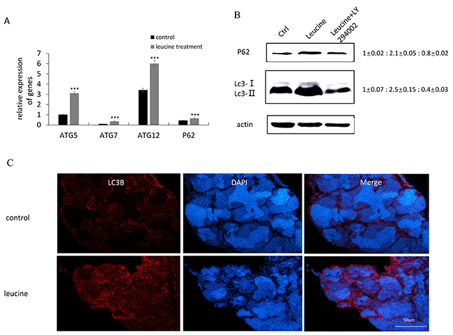 The effects of leucine treatment on autophagy in zebrafish testis. (A) The mRNA expression of autophagy related genes atg5, atg7, atg12 and p62 were evaluated by qRT-PCR. (B) Representative immunoblots showed P62 and Lc3 proteins after leucine and LY294002 administration. Actin was used as the control. Relative protein levels of P62 and Lc3-II were shown from 3 independent experiments. (C) Representative immunofluorescence pictures to detect Lc3 levels in control and leucine-treated zebrafish testes. Scale bar: 50 μm. Bars represent mean ± SEM of more than three separate experiments. *P < 0.05, **P < 0.01 and ***P < 0.001.