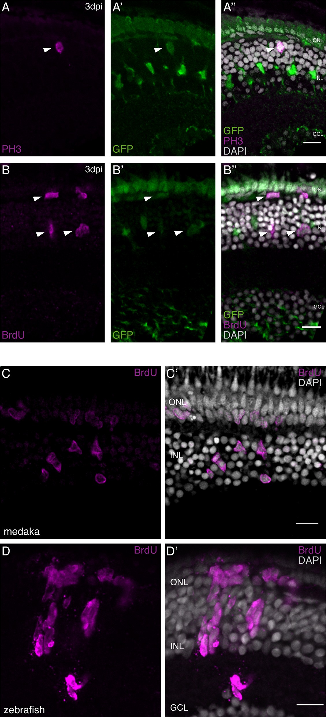 (A–A’’) Cryosection of a needle-injured hatchling medaka retina of the transgenic line rx2::H2B-eGFP. PH3 stainings (magenta) on the hatchling medaka retinae 3 days post needle injury show mitotic cells present in the central retina (arrowhead), co-localizing with the rx2 nuclear reporter expression (green). (n = 4 fish, data obtained from two independent experiments). (B–B’’) Cryosection of a needle-injured hatchling medaka retina of the transgenic line rx2::H2B-eGFP. A 3-day pulse of BrdU marks proliferating cells in the central retina after needle injury (arrowheads). BrdU staining (magenta) co-localizes with rx2 nuclear reporter expression (green), indicating that olMG cells re-entered the cell cycle. (n = 6 fish, data obtained from three independent experiments). (C, C') Cryosection of a needle-injured hatchling medaka retina. BrdU-positive (magenta) single cells are present in the INL and ONL. (n = 6 fish, data obtained from two independent experiments). (D, D') Cryosection of a needle-injured zebrafish retina. BrdU-positive (magenta) neurogenic clusters are present in the INL. Additionally, BrdU-positive proliferating cells can be detected in the ONL (n = 3 fish, data obtained from two independent experiments). Scale bars are 10 μm.