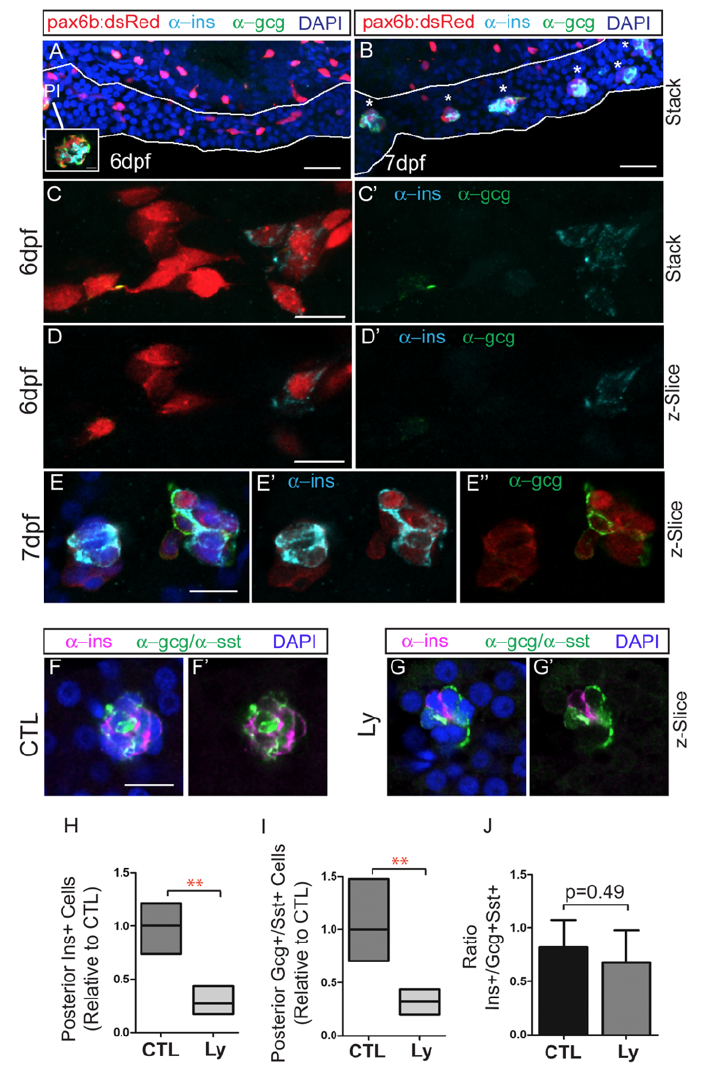 Immunohistochemistry of pax6:dsRed larvae at 6 dpf (A, C, D) and 7 dpf (B, E) treated to induce secondary islets, labeled with anti-dsRed (red), anti-ins (cyan) and anti-gcg (green) antibodies. Pancreas is outlined in white (A,B). Inset in (A, white box), single z-plane view of principal islet (PI) shows robust staining with anti-ins and anti-gcg. (A,B) Scale bar = 25μm (C-E) Scale bar = 10μm. (F,G) Endocrine hormone expression detected by antibody staining at 8 dpf, following islet induction in controls (CTL) and Ly294002-treated (LY) samples. Nuclei are counterstained with DAPI. Scale bar = 10μm. (H), (I) Relative numbers of cells from samples as in (F,G), expressing Ins (H) and Gcg (I), as compared to controls. Box plot graphs maximum to minimum, line at mean, n=4 per group, **p <0.01 (t-test). (J) Ratio of ins to gcg/sst expressing cells, plotted is the mean ± S.D.