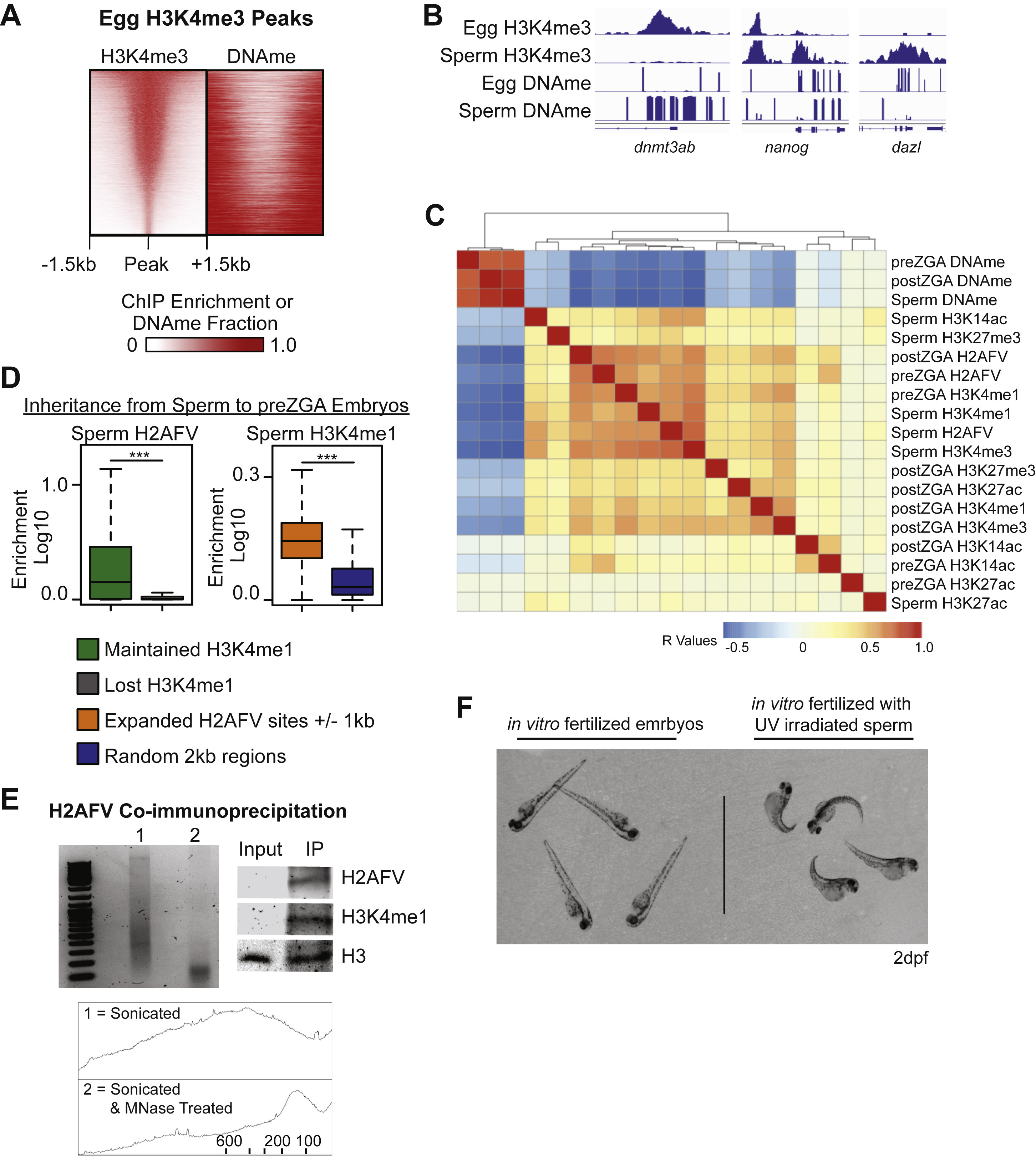 (C) Clustering of pairwise Pearson correlation R values for all epigenetic features assayed in sperm, and in pre- and post-ZGA embryo samples. H2AFV and H3K4me1 are most strongly correlated with one another and anti-correlated with DNAme.