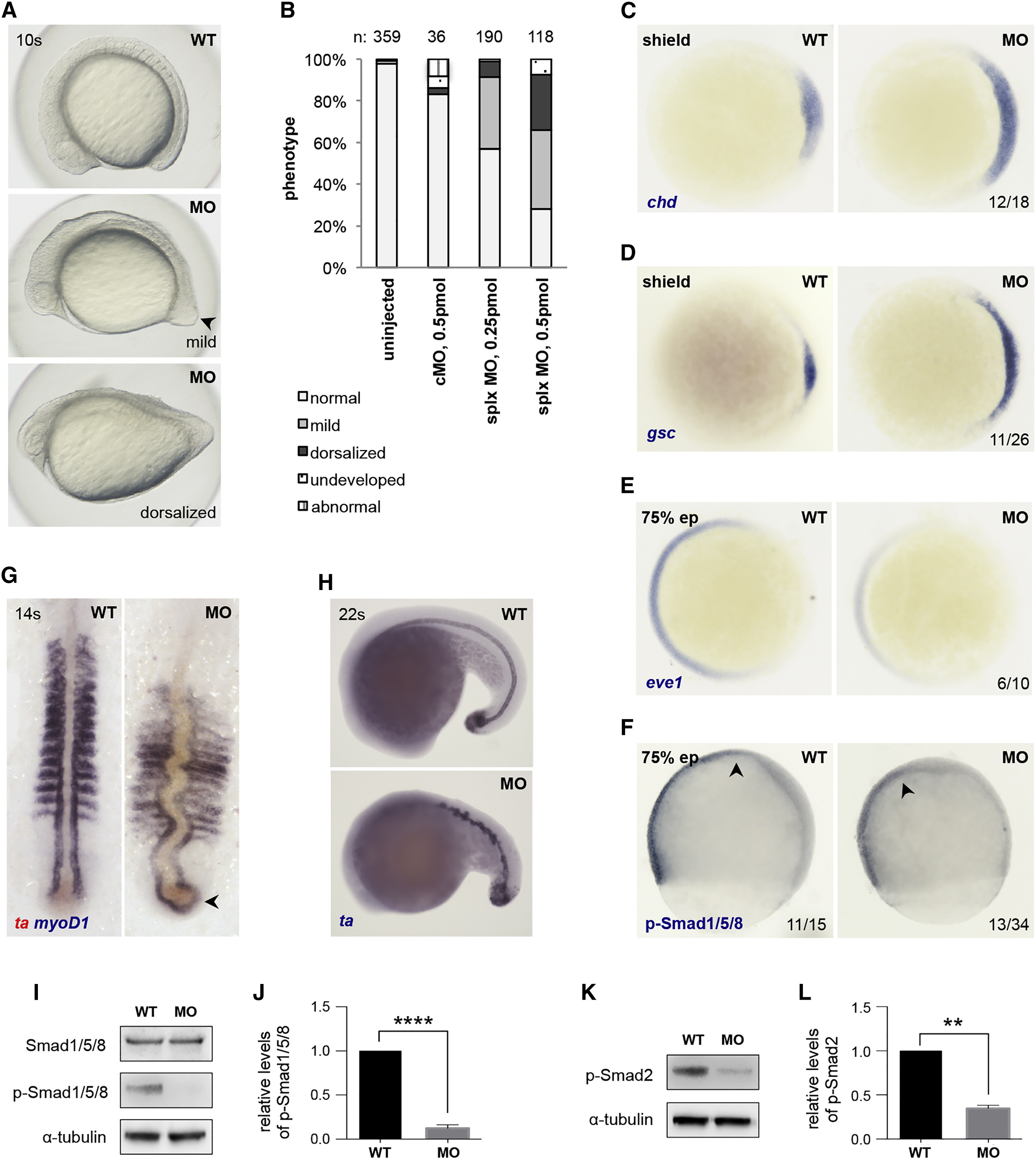 (F) The phosphorylation level of Smad1/5/8 is slightly reduced in morphants. The thickened embryonic tissue in the morphants indicates dorsalization of the embryo (arrow). Lateral views, dorsal to right.