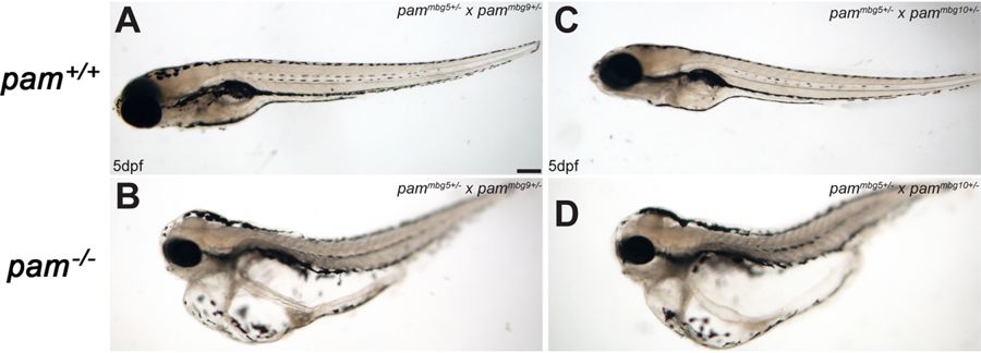 Heteroallelic pam−/− zebrafish display severe edema. Heterozygous zebrafish bearing different pammbg alleles were crossed and the phenotypes of the resulting pam−/− heteroallelic embryos and their wildtype siblings were examined at 5 dpf. Wildtype pam+/+ embryos developed normally (A,C). In contrast, heteroallelic pam−/− homozygotes (pammbg5/pammbg9 and pammbg5/pammbg10) derived from pammbg5+/− × pammbg9+/− and pammbg5+/− × pammbg10+/− crosses exhibited severe edema (B,D).