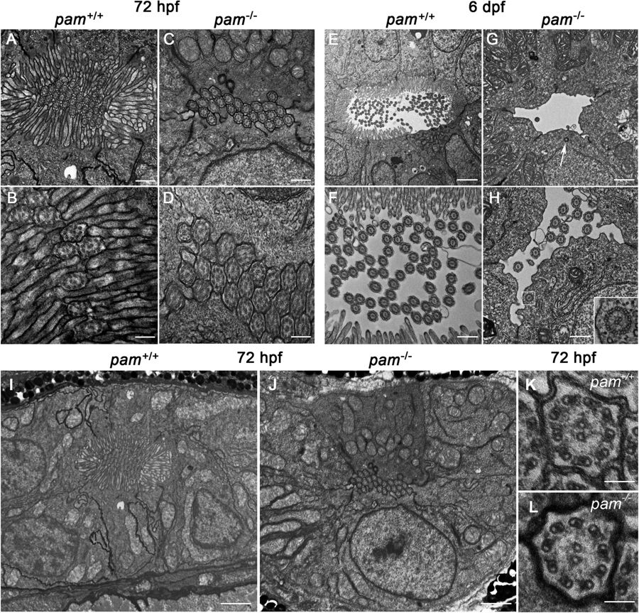 pam−/− zebrafish exhibit microvillar and ciliary assembly defects in the pronephros. Transmission electron micrographs of transverse sections through the pronephros of pam−/− embryos and their wildtype siblings at 72 hpf (A–D and I,J) and 6 dpf (E–H); the images shown were taken from approximately midway along the pronephros. At 72 hpf, the pronephros lumen of wildtype zebrafish is occluded with numerous cilia surrounded by a dense array of microvilli (A,B). Although densely packed cilia were evident in the pronephric lumen of pam−/− embryos at this stage, brush border microvilli were absent (C,D). At 6 dpf, the lumen of the wildtype zebrafish pronephros was more open; numerous cilia appeared in the lumen, which was surrounded by epithelial cells extending a dense array of microvilli (E,F). In contrast, the lumen of the pam−/− pronephros showed a severe reduction in the number of cilia along with the continued absence of a brush border (G,H). Occasional cytosolic axonemes (inset in H) and undocked centrioles/basal bodies (arrow in G and see Supplemental Fig. S6) were observed in the epithelial cells lining the pronephric duct of the pam−/− embryos. Lower magnification images (I,J) of the region surrounding the pronephros of the 72 hpf embryos shown in panels (A,B) illustrate the general cellular architecture. The cilia present in pam−/− embryos at 72 hpf were morphologically normal (K,L). Bars = 100 nm (K,L), 500 nm (A,C,F,H), 250 nm (B,D), 1 μm (G) and 2 μm (E,I,J).