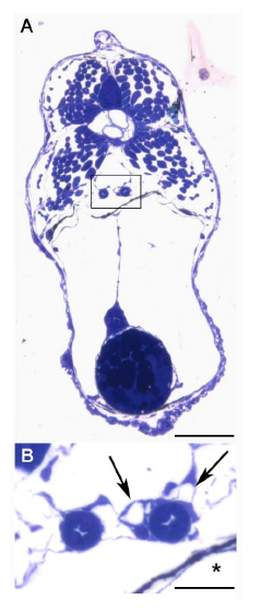 Toluidine blue-stained transverse section through a 6 dpf pam-/- embryo. Massive edema was evident (*) as were cyst-like structures (arrows) which were routinely observed associated with the pronephric tubules. The boxed region in A is shown at higher magnification in B. Bars = 10 and 2.5 μm for panels A and B, respectively.