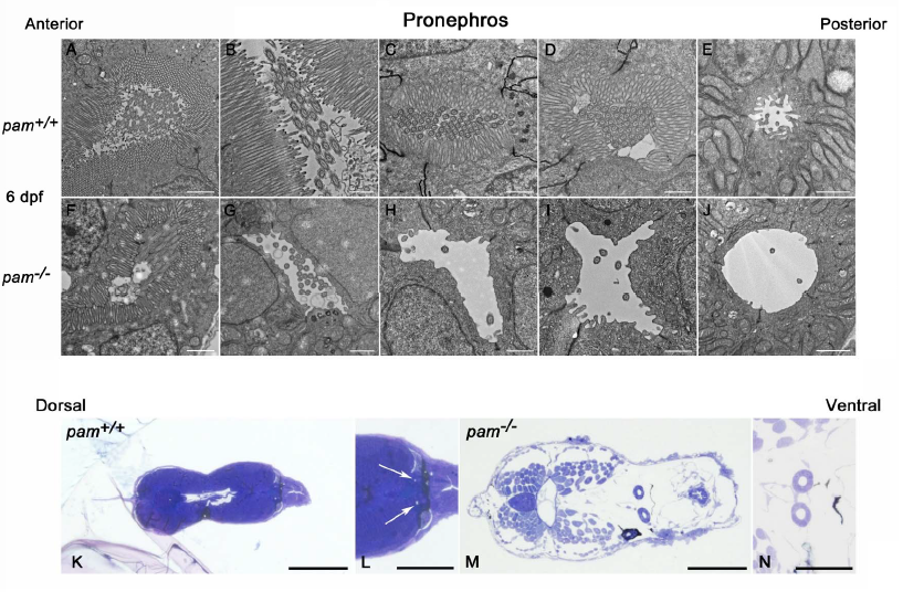 Lower panels – Bright-field micrographs of toluidine blue-stained transverse thick sections through wildtype (K, L) and Pam-null (M, N) 6 dpf embryos; the vastly different appearance of the mutant embryos is due to the massive edema. Higher magnification images of the pronephric region (L, N) revealed that the pronephros lumen (white arrows in L) in the pam+/+ embryo was almost occluded, whereas it was more open in the pam-/- animals. Bars = 10 (K, M) and 5 (L, N) μm.
