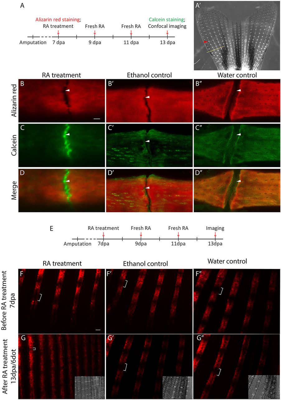RA treatment leads to bone matrix deposition between bone segments. (A) Fish with regenerating fins (7 dpa) were stained with Alizarin Red, and then treated with RA for 6 days. At 6 dot/13 dpa, fins were stained with calcein. (A′) The first joint proximal to the first bifurcation on the second most dorsal fin ray was analyzed (red arrowhead). Yellow dashed line indicates amputation plane. (B-B″) Alizarin Red staining alone shows no difference between RA-treated and control joints (white arrowheads). (C) Calcein staining indicates new bone matrix being deposited within joint spaces (white arrowhead) following RA treatment. (C′,C″) No new bone is observed in ethanol (C′) and water (C″) controls (white arrowheads). (D′-D″) Merged images of Alizarin Red and calcein staining. (E) Tg(bglap:mCherry) fish at 7 dpa were treated with RA for 6 days and imaged. (F-F″) At 0 dot/7 dpa (before RA treatment), mature osteoblasts are not observed in joint regions of fin regenerates (white brackets). (G) At 6 dot/13 dpa, a decrease in gap size (white brackets) is observed in RA-treated fish compared with ethanol (G′) and water (G″) controls. Insets in G-G″ are bright-field images to show the ray joints. Scale bars: 10 μm (in B for B-D″); 100 μm (in F for F-G″).