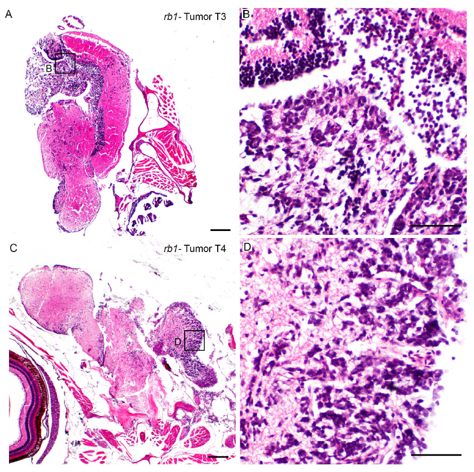 Histological analysis of neoplastic populations in TALEN induced rb1-brain tumor T3 and T4 is consistent with primitive neuroectodermal-like tumor. H&E stained sections of tissue remaining after dissection of tumors T3 (A, B) and T4 (C, D) used for transcriptome analysis. Sections exhibit an unencapsulated, multifocally infiltrative neoplastic population within the neuropil. Neoplastic cells are small with deeply basophilic, round to oval to wedge-shaped nuclei, densely clumped chromatin, and scant amounts of cytoplasm. Scale bars A, C 200μm; B, D 50 μm.