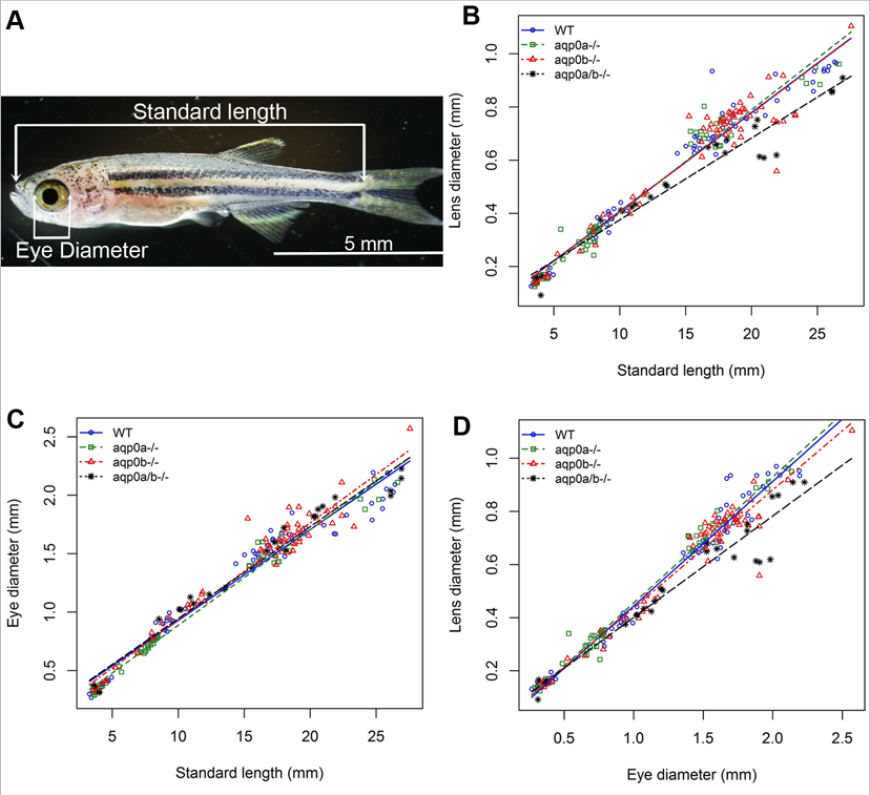 (A) Zebrafish standard length (snout to start of tail) was used to determine developmental stage in juvenile-adult fish. (B) Post-embryonic double mutant lenses grow more slowly than WT or single aqp0 mutants (p-values for estimated difference in estimated regression slopes: WT vs double mutant 0.000769; double mutant vs aqp0a-/- 6.87e-05; double mutant vs aqp0b-/- 0.00114; see Supp. Figure 1). (C) Eye growth rate was unaffected in the mutants, thus the lens diameter versus eye diameter also revealed a slower lens growth compared to eye diameter fo the double mutants.
