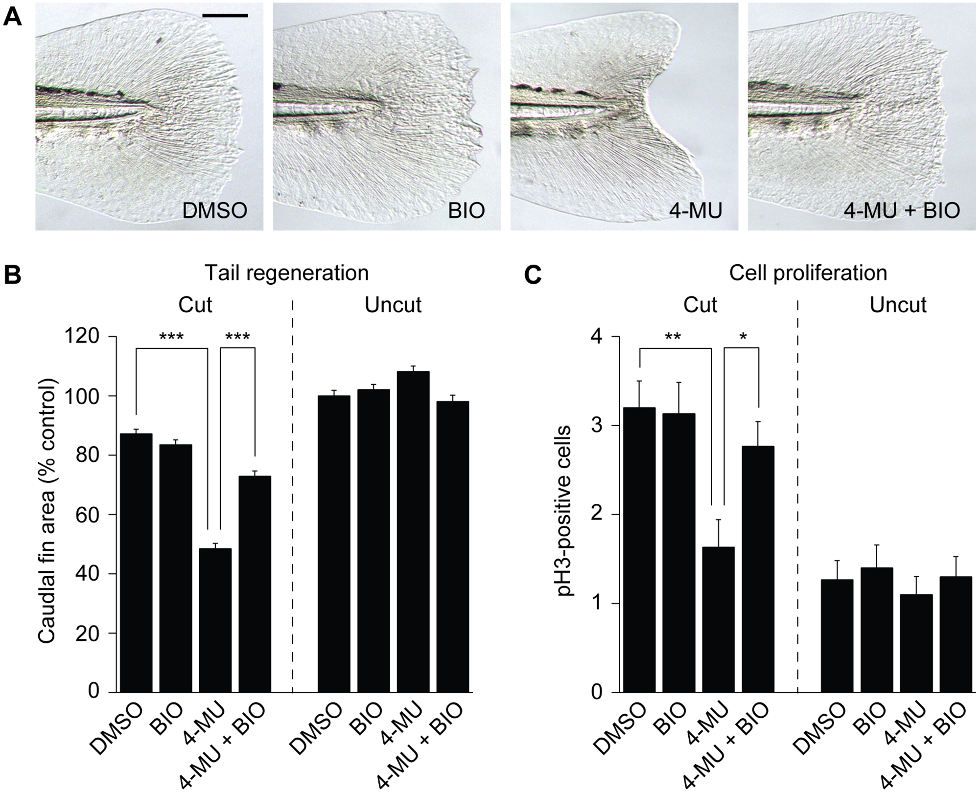 (A) Representative micrographs of larval tails that were amputated at 2 dpf and treated with 0.5% DMSO, 100 nM BIO, 150 μM 4-MU, or 150 μM 4-MU with 100 nM BIO for the next 24 hours. Caudal fins of 5-dpf (3-dpa) larvae are shown. Scale bar: 100 μm. (B) Caudal fin sizes at 5 dpf (3 dpa) for the indicated amputation and inhibitor treatment regimens (compound administration from 2 to 3 dpf). Data are the average caudal fin areas of 15 larvae ± s.e.m., normalized to the average fin size of uncut larvae treated with 0.5% DMSO. (C) Cell proliferation within the 4-dpf caudal fin in response to the indicated amputation and inhibitor treatment regimens. Data are the average number of pH3-positive cells in 30 larval tails ± s.e.m. (R1 + R2 regions; see Fig 9). *, P < 0.05; **, P < 0.01; ***, P < 0.001.