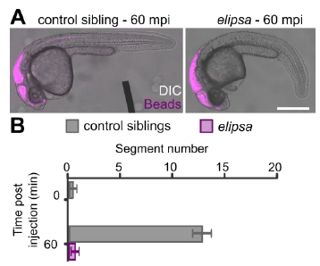 A. Superimposed images of transmitted light (DIC) and fluorescent 20-nm diameter beads (magenta) injected in the third ventricle of 30 hpf control sibling and elipsa mutant embryos. Beads are transported down the central canal in straight control siblings, but not in elipsa mutants as shown 60 minutes post-injection (mpi). Scale bar represents 0.5 mm. The progression of the fluorescence front in the central canal is quantified in B as the segment number reached 60 minutes after injection (mean ± SEM) in control sibling (n = 3) and elipsa mutant embryos (n = 5) (p = 0.0014; t = 12.46, df = 2.84, two tailed t-test).