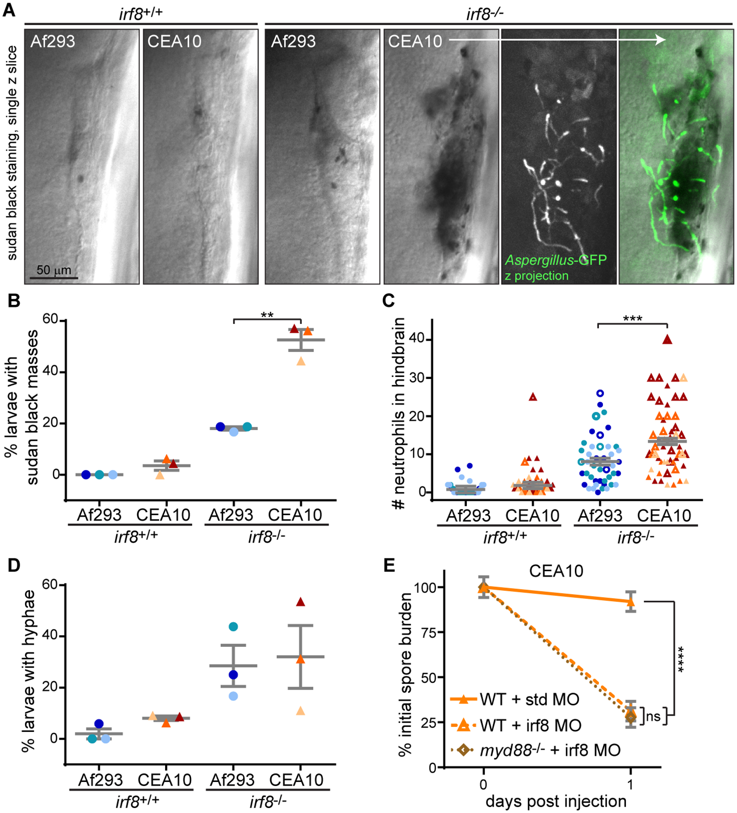 A-D. Macrophage-deficient (irf8-/-) or control (irf8+/+) larvae were infected with YFP- or GFP-expressing A. fumigatus TBK1.1 (Af293) or TFYL49.1 (CEA10) strains, fixed 1 dpi, and stained for neutrophils (sudan black). Representative images are shown (A, scale bar represents 50 μm) and percent of larvae per experiment with sudan black masses (B), number of neutrophils at infection site (C), and percent of larvae per experiment with A. fumigatus hyphae (D) were quantified. N>9 larvae each condition each replicate. For percentage of larvae with sudan black masses or hyphae (B, D), each symbol represents one replicate, bars represent means ± SEM, P values calculated by t test. For neutrophil number quantification (C), each symbol represents one larvae. Larvae with sudan black masses where neutrophil numbers were difficult to count and represent underestimations are denoted with open symbols. Bars represent lsmeans ± SEM from 3 pooled replicates, P values calculated by ANOVA. All symbols are color-coded by replicate. E. Wild-type or myd88-/- embryos were injected with control (std) or macrophage-depleting (irf8) morpholinos. Larvae were then infected with TFYL49.1 (CEA10) spores and CFUs were measured. Average injection CFUs = 38. CFU data represent lsmeans ± SEM of 3 pooled replicates, n = 24 larvae (3 replicates, 8 larvae each) per condition per day, P values calculated with ANOVA. See also S7 Fig.