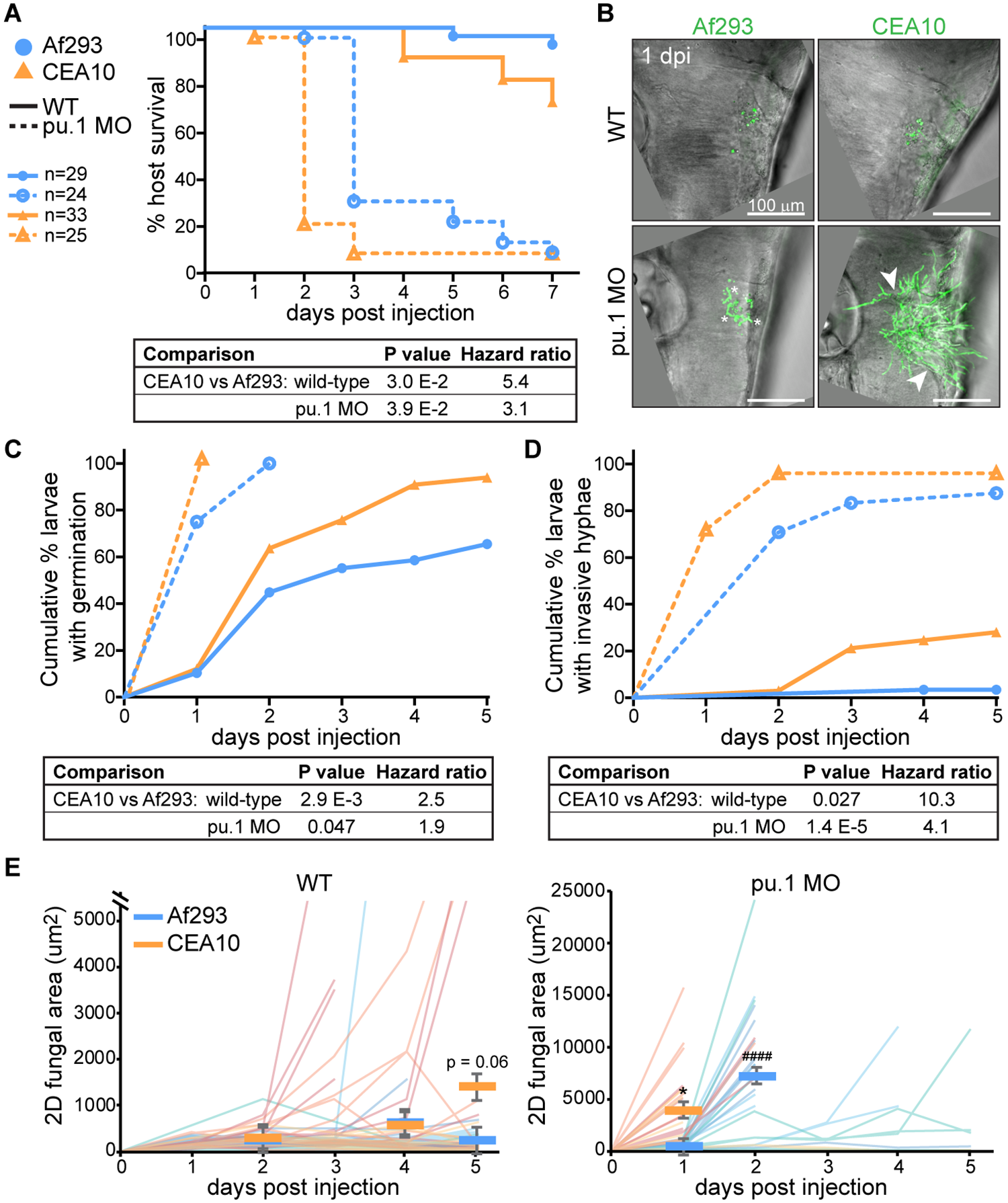 Wild-type or phagocyte-deficient (pu.1 morpholino) larvae were infected with YFP- or GFP-expressing A. fumigatus TBK1.1 (Af293) or TFYL49.1 (CEA10). All graphs represent data from 3 pooled replicates, Ns and labels noted in (A) are applicable for all data. A. Larval survival was monitored, P values calculated by Cox proportional hazard regression analysis. B-E. Larvae were imaged days 1–5 post injection and fungal growth was measured. Representative z-projection images 1 dpi are shown (B). Scale bar represents 100 μm. Asterisks indicate examples of germinated spores, arrowheads indicate examples of invasive hyphae. Cumulative percent of larvae with germinated spores (C) and with invasive hyphae (D) was calculated, P values were calculated by Cox proportional hazard regression analysis. 2D GFP+ fungal area was measured from maximum intensity projection images of individual larvae for 5 days of infection (or until larvae succumbed) (E). Each line represents one larvae followed for the entire course of infection, lines are color-coded by replicate, bars represent pooled lsmeans ± SEM, P values were calculated by ANOVA. See also S8 Fig.