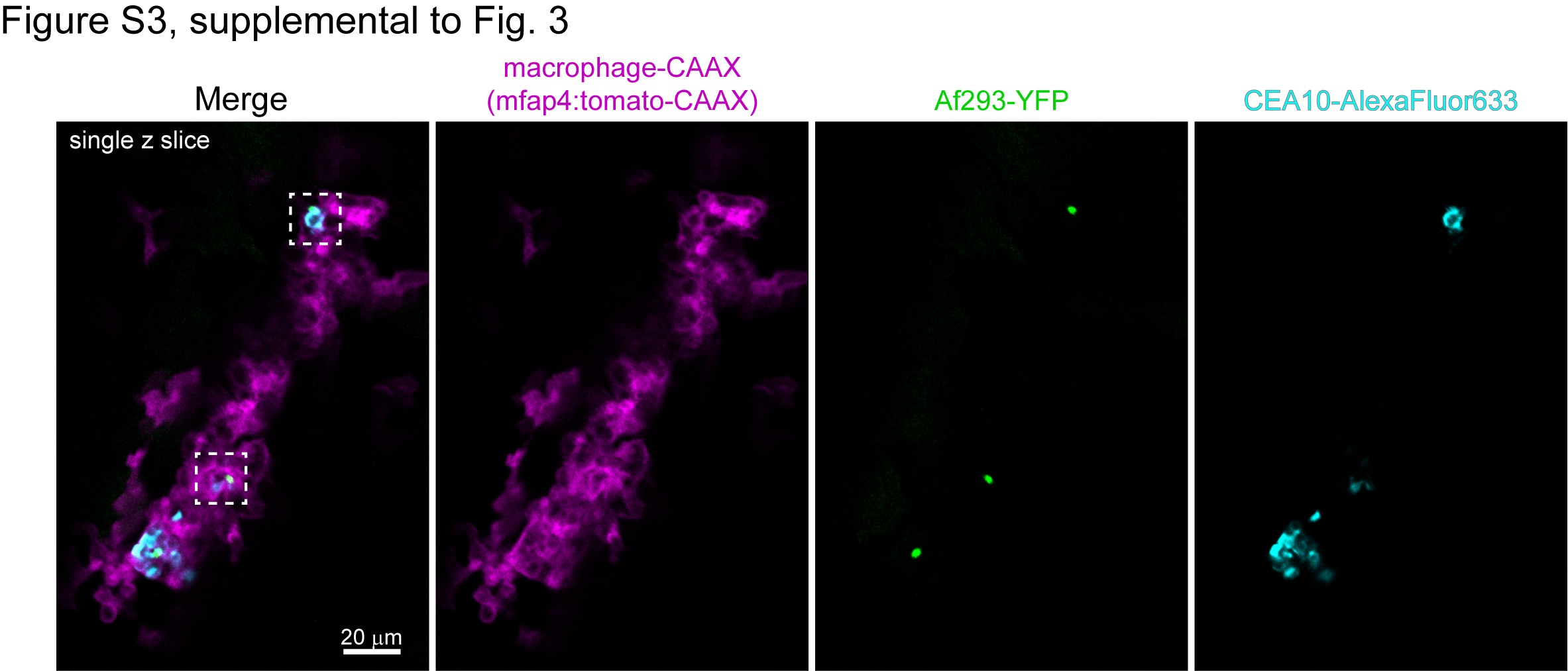 Macrophage-membrane labeled larvae (mfap4:tomato-CAAX) were co-infected with YFP-expressing TBK1.1 (Af293) and AlexaFluor633-labeled CEA17 KU80Δ (CEA10) and imaged 1 dpi. A single z-slice image containing the entire hindbrain region of a representative larvae is shown. Scale bar represents 20 μm. Boxes indicate regions shown at higher magnification in Fig 3C.