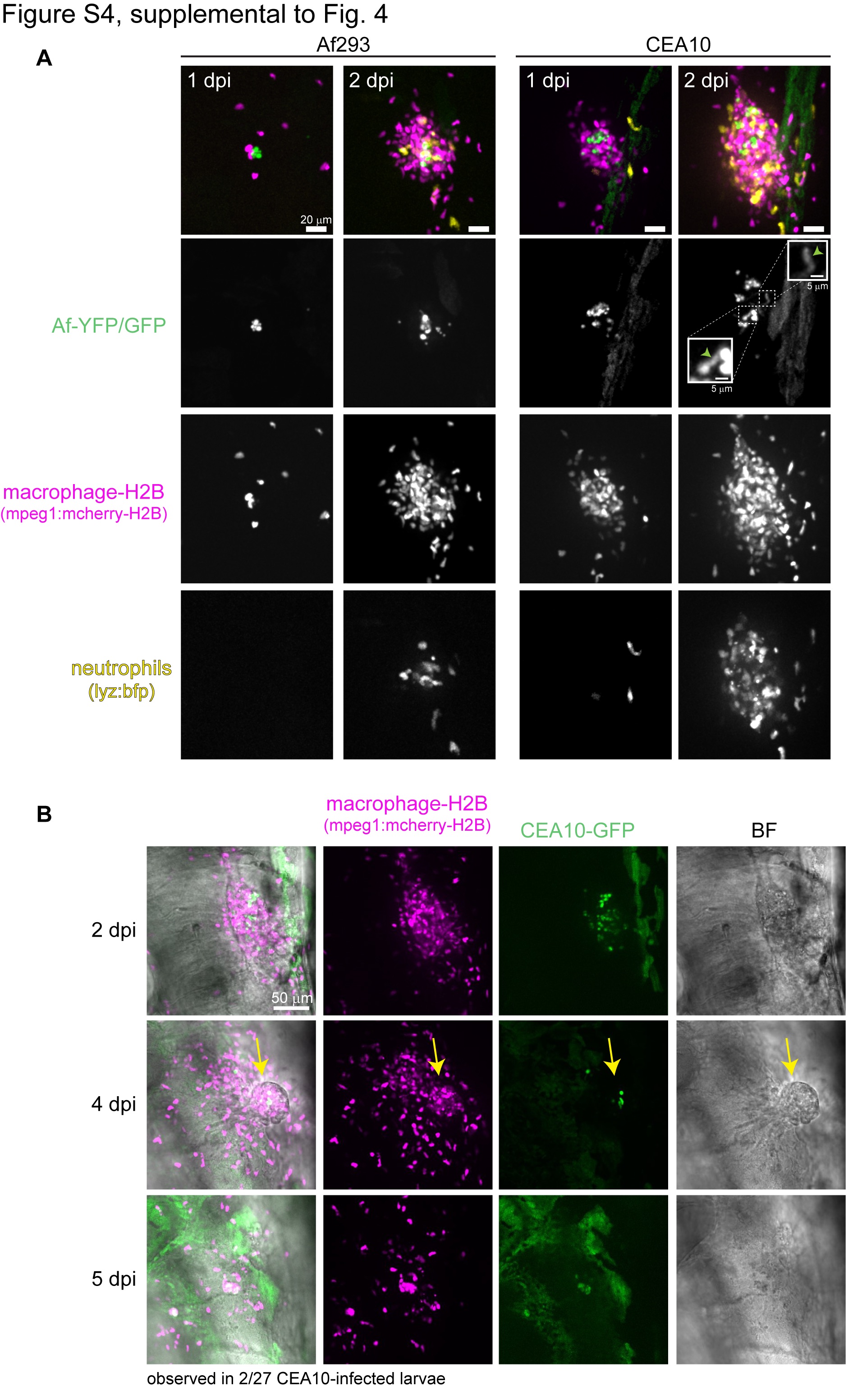 A. Individual channels of images from Fig 4C are shown. Representative z projection images of dual macrophage-nuclear (mpeg1:mcherry-H2B) and neutrophil (lyz:BFP) labeled larvae infected with YFP- or GFP-expressing A. fumigatus TBK1.1 (Af293) or TFYL49.1 (CEA10) strains and imaged days 1 and 2 post injection. Scale bar represents 20 μm, inset scale bar represents 5 μm. Examples of spore germination inside the cluster are marked in insets with arrowheads. B. Nuclear macrophage labeled larvae (mpeg1:mcherry-H2B) were infected with GFP-expressing TFYL49.1 (CEA10). Z-projection (mcherry, GFP) or single slice (BF) images of the same larvae on days 2, 4, and 5 dpi are shown. Extrusion at 4 dpi is marked with an arrow. Scale bar represents 50 μm.