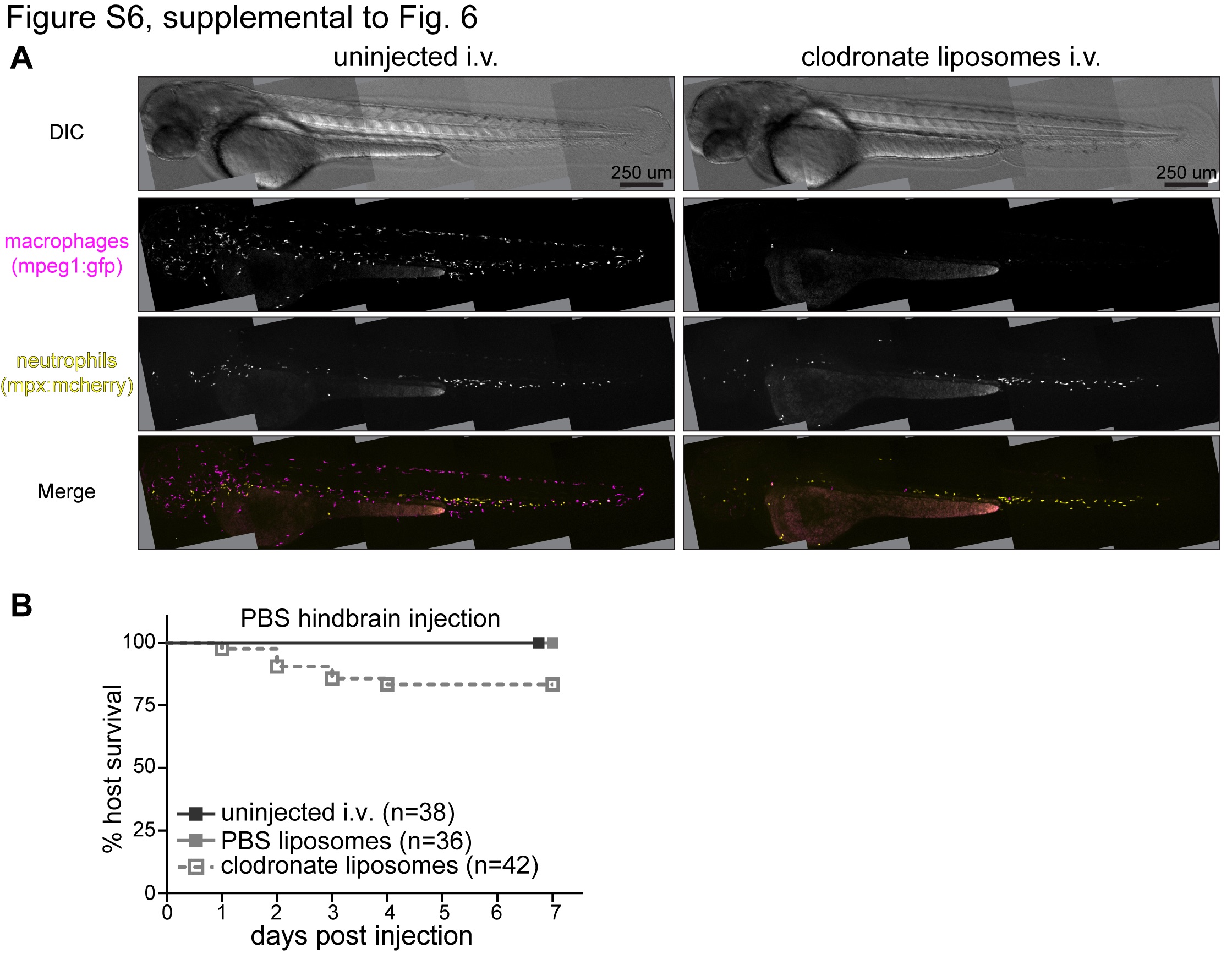 A. Dual macrophage (mpeg1:GFP) and neutrophil (mpx:mCherry) labeled larvae were injected with clodronate liposomes, or left uninjected, and imaged 24 hours later. Z-projection (GFP, mcherry) or single slice (BF) images are shown. Scale bar represents 250 μm. B. PBS was injected into the hindbrains of clodronate liposome-injected or control (PBS liposomes and/or uninjected i.v.) larvae and survival was monitored. Data shown are from 3 pooled replicates.