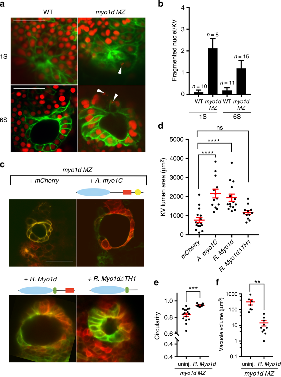 Conservation of Myosin I protein function. a, b Loss of myo1d results in increased nuclear fragmentation. Tg(dusp6:GFP-MA) or myo1d MZ; Tg(dusp6:GFP-MA) embryos injected with H2BmCherry mRNA exhibit fragmented nuclei in KV epithelial cells and quantified as fragmented nuclei per KV sample. Fragmented nuclei are represented as absolute numbers per KV Z-section. c–f Overexpression of amoeba myo1C (n = 13) or rat Myo1d (n = 15) were sufficient to rescue lumen area in myo1d MZ embryos compared to uninjected controls (n = 16) (d), circularity (n = 16 myo1d MZ, n = 10 rat Myo1d injected MZ embryos) (e), and reduced vacuole size (n = 9 myo1d MZ, n = 10 rat Myo1d injected MZ embryos) (f) in myo1d MZ mutants. However, rat Myo1d lacking the TH1 domain (myo1d∆TH1) (n = 12) failed to restore lumen size (d). Unpaired t test or one-way ANOVA with post hoc Turkey’s multiple range tests were conducted with, **p < 0.01, ***p < 0.005, ****p < 0.0001 represents statistical significance. ns not significant. Data shown are mean ± SEM