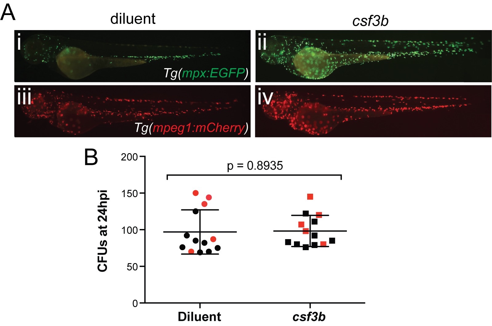 - (B) Overexpression of csf3b does not affect T. marneffei CFU counts at 24 hpi compared to controls. Black and red points represent results obtained from independent experiments.