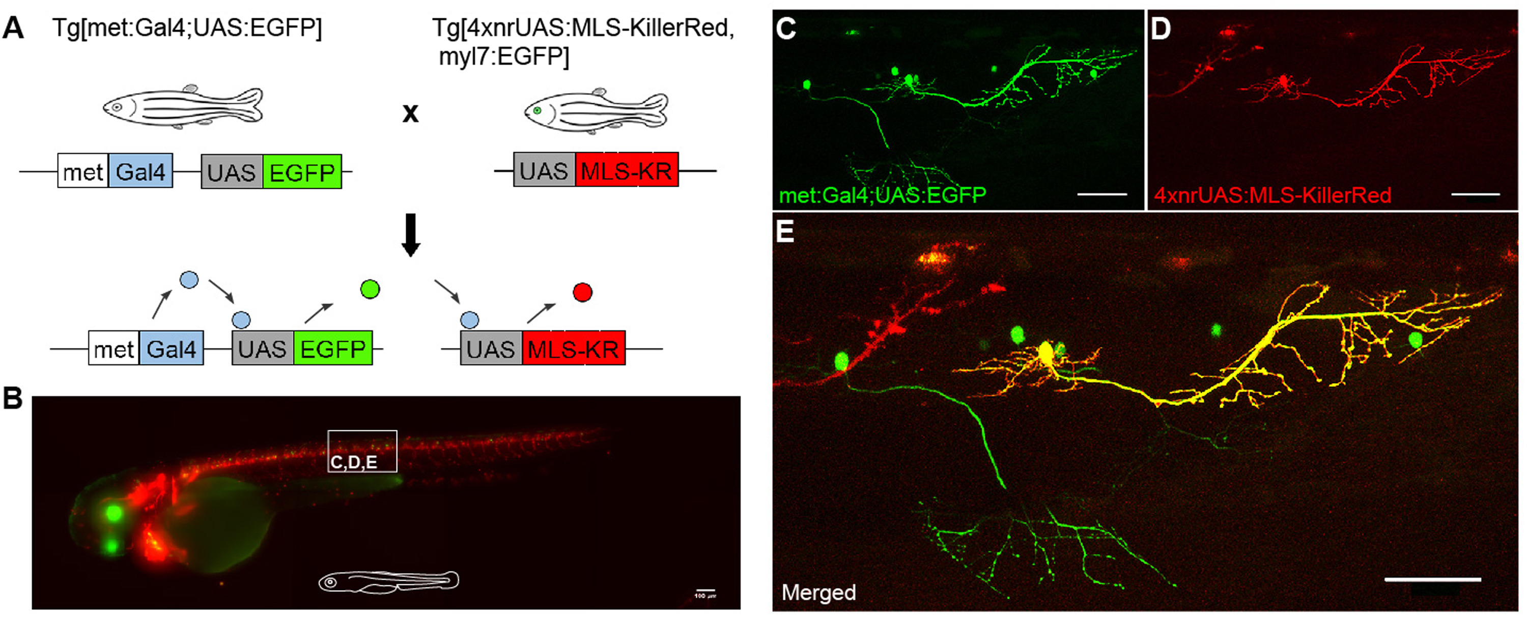 Generation of mosaic KR expression utilising GAL4-UAS regulation. (A) The GAL4/upstream activating sequence (UAS) system is a powerful method for analysing cell function in vivo. The yeast GAL4 transcription factor activates the transcription of target genes by binding to UAS cis-regulatory sites. The Gal4/UAS system can be used as two-component gene expression system carried in separate lines. The driver line (Tg[met:Gal4; UAS:EGFP]) provides tissue-specific GAL4 expression and the responder line (Tg[4xnrUAS:MLS-KR, cryaa:EGFP]) carries the coding sequence for the gene of interest under the control of the UAS site. In the double transgenic F1 embryos, Gal4 expressing cells are visualized by fluorescent reporters, providing mosaic expression of the gene of interest (modified after Asakawa & Kawakami, 2008). (B) Zebrafish embryo at 3 dpf expressing both met:EGFP (green) and KR (red) (Tg[met:Gal4;UAS:EGFP;4xnrUAS:MLS-KillerRed, cryaa:EGFP]). (C-E) 5 dpf zebrafish larvae show mosaic expression for both KR-ve/EGFP+ve (C, E (green)), KR+ve/EGFP-ve (D, E (red)) and KR+ve/EGFP+ve (E (yellow)) motor neurons. All images are lateral views, anterior to the left, dorsal to the top. Scale bar 50 µm.