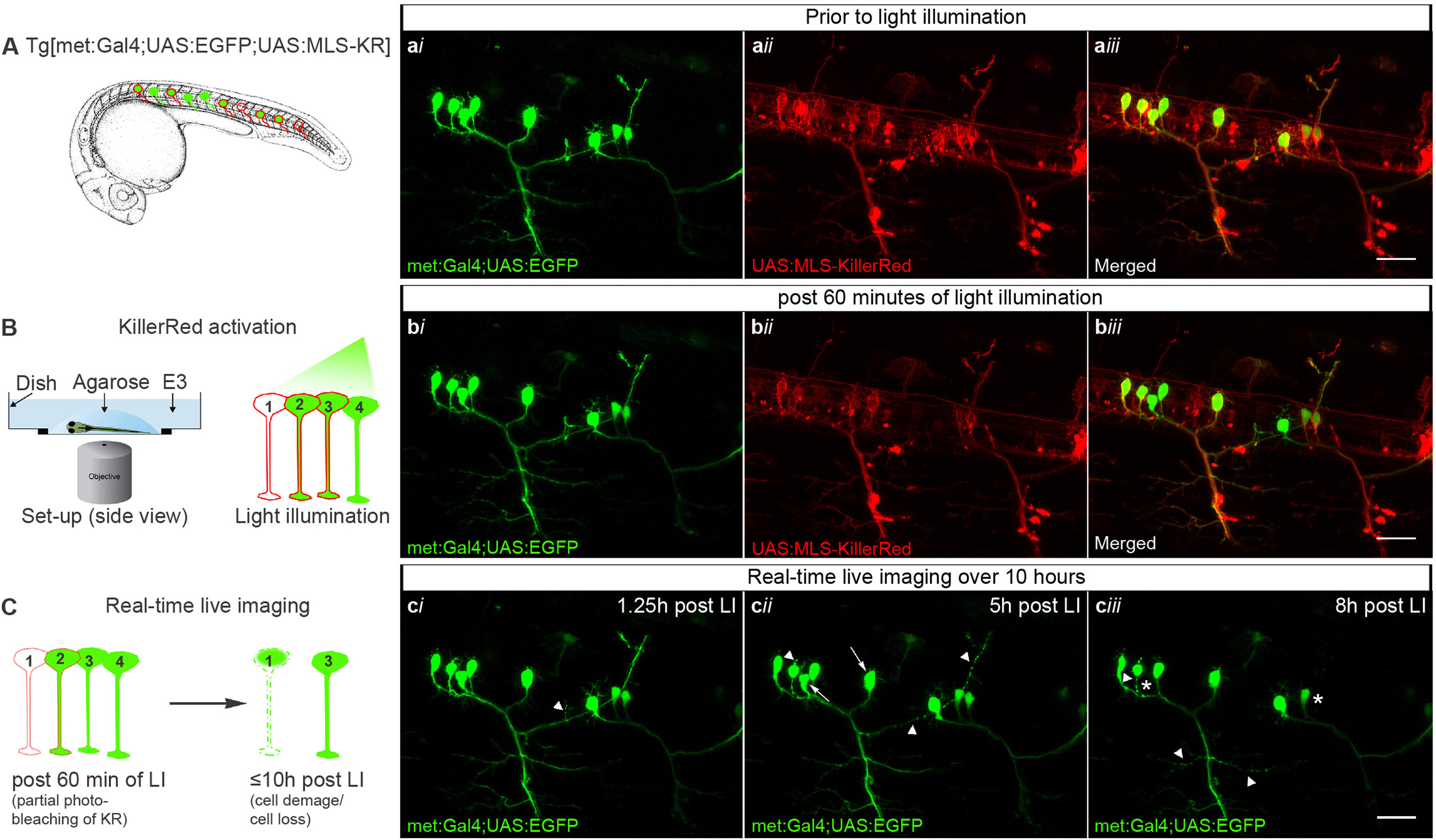 KR-mediated ROS production leads to MN degeneration. (A) A transgenic zebrafish (Tg[met:Gal4;UAS:EGFP];Tg[UAS:MLS-KR]) mosaically expressing EGFP (green; ai) and KR (red, aii) in individual neurons prior to light illumination and KR-activation (aiii). (B) Light illumination of fluorescent neurons leads to bleaching of KR fluorescence, evident 60 min post-illumination (bii), while EGFP fluorescence intensities remained unchanged (bi). (C) Live imaging of KR activated neurons for up to 10 h revealed a series of morphological changes including progressive anterograde degeneration (ci-ciii, arrowheads), soma shrinkage (arrows) and MN death (asterisks). Scale bar 25 µm.