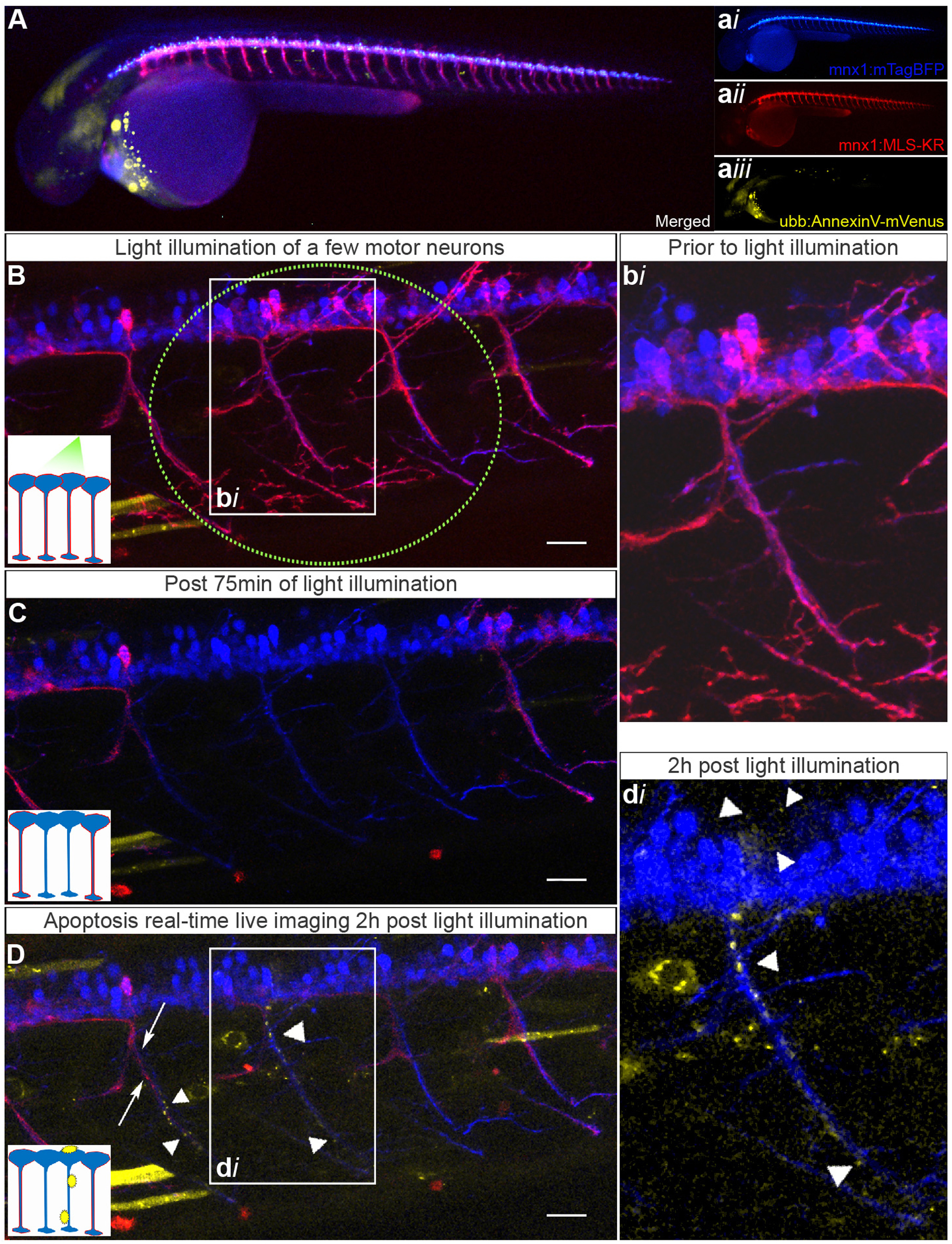 KR activation lead to ANNEXINV (A5) accumulation and degeneration of MNs. (A) Triple fluorescent zebrafish (2 dpf) positive for KR (red) and TagBFP (blue) selectively in MNs, as well ubiquitous expression of A5 (yellow), were used to visualise apoptotic processes after oxidative stress induction through KR illumination. (B) Prior to light illumination within a restricted area (green dotted line) of the zebrafish spinal cord, MNs showed high intensities of KR and TagBFP expression (bi). (C) Following light illumination for 75 min the fluorescence intensity of KR (red) was markedly reduced in the light-exposed region while no changes in TagBFP-intensities could be observed. (D) Time-lapse imaging following KR activation revealed A5 accumulation (di, arrowheads) along the axon and cell soma selectively within the light-activated area (2 h post-illumination). Scale bars 25 µm.