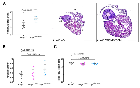 Adult kcnj8[V65M] fish show enlarged ventricular area. (A) Ventricular area in homozygous kcnj8[V65M] mutants. Representative heart histology of adult kcnj8V65M/V65M mutants and wildtype siblings after H&E staining. Exemplary depiction of 1 WT and 1 kcnj8[V65M] heart. For assessment of ventricular chamber size, tissue sections showing the largest ventricular area were selected and area was quantified using ImageJ (NIH). (B) Atrial area in heterozygous and homozygous kcnj8[V65M] mutants. For assessment of atrial chamber size, tissue sections showing the largest atrial area were selected and area was quantified using ImageJ (NIH). (C) Total body length in kcnj8[V65M] mutants. To account for variations in heart size overall body length was measured from the tip of the head to the end of the trunk (before the caudal fin). kcnj8+/+ controls are the same as in Fig.2E. For all graphs, significance was determined by twotailed unpaired Student's t test or Mann–Whitney two-tailed U test: * p≤0.05; ** p≤0.01; *** p≤0.001; **** p≤0.0001. The black horizontal bar indicates the mean value for each condition. Sample size, kcnj8+/+, n=6; kcnj8+/V65M, n=6; kcnj8V65M/V65M, n=6 in A-C. Scale bars, 500 μm in A. All embryos analyzed originated from group matings of adult zebrafish.