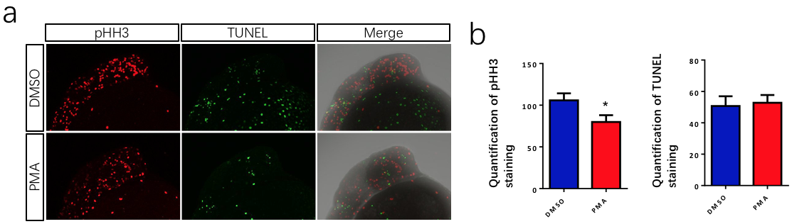 PKC hyper-activation has a mild effect on neurogenesis at 24hpf (a) pHH3 and TUNEL staining of zebrafish embryos. (b) Quantification of pHH3 and TUNEL staining within zebrafish head. (* p<0.05, t-test).