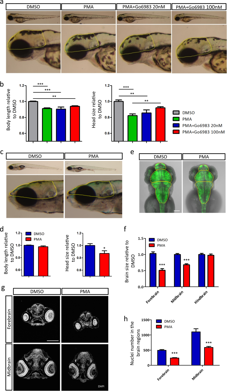 a Lateral views of representative larvae (3 dpf) exposed to DMSO, PMA or PMA+Go6983. Head size was calculated with the boundary shown in yellow dotted line. b Quantitative representation of body length and head size (3 dpf) normalized to DMSO (DMSO n = 8, PMA n = 10, PMA+Go6983 20 nM n = 6, PMA+Go6983 100 nM n = 10, **p < 0.01, ***p < 0.001, one-way ANOVA). c Lateral views of representative larvae (9 dpf) previously exposed to DMSO or PMA. Head size was calculated with the boundary shown in yellow dotted line. d Quantitative representation of body length and head size (9 dpf) normalized to DMSO (DMSO n = 8, PMA n = 6, *p < 0.05, t-test analysis). e Dorsal views of zebrafish brains (3 dpf) visualized by Huc:GFP. Brain region was divided by yellow dotted line. Scale bar, 100 μm. f Quantitative representation of different brain regions normalized to DMSO (n = 16 per group, ***p < 0.001, t-test analysis). g DAPI staining of zebrafish head sections (3 dpf). Scale bar, 100 μm. h Nuclei number in forebrain and midbrain (n = 6 per group, ***p < 0.001, t-test)