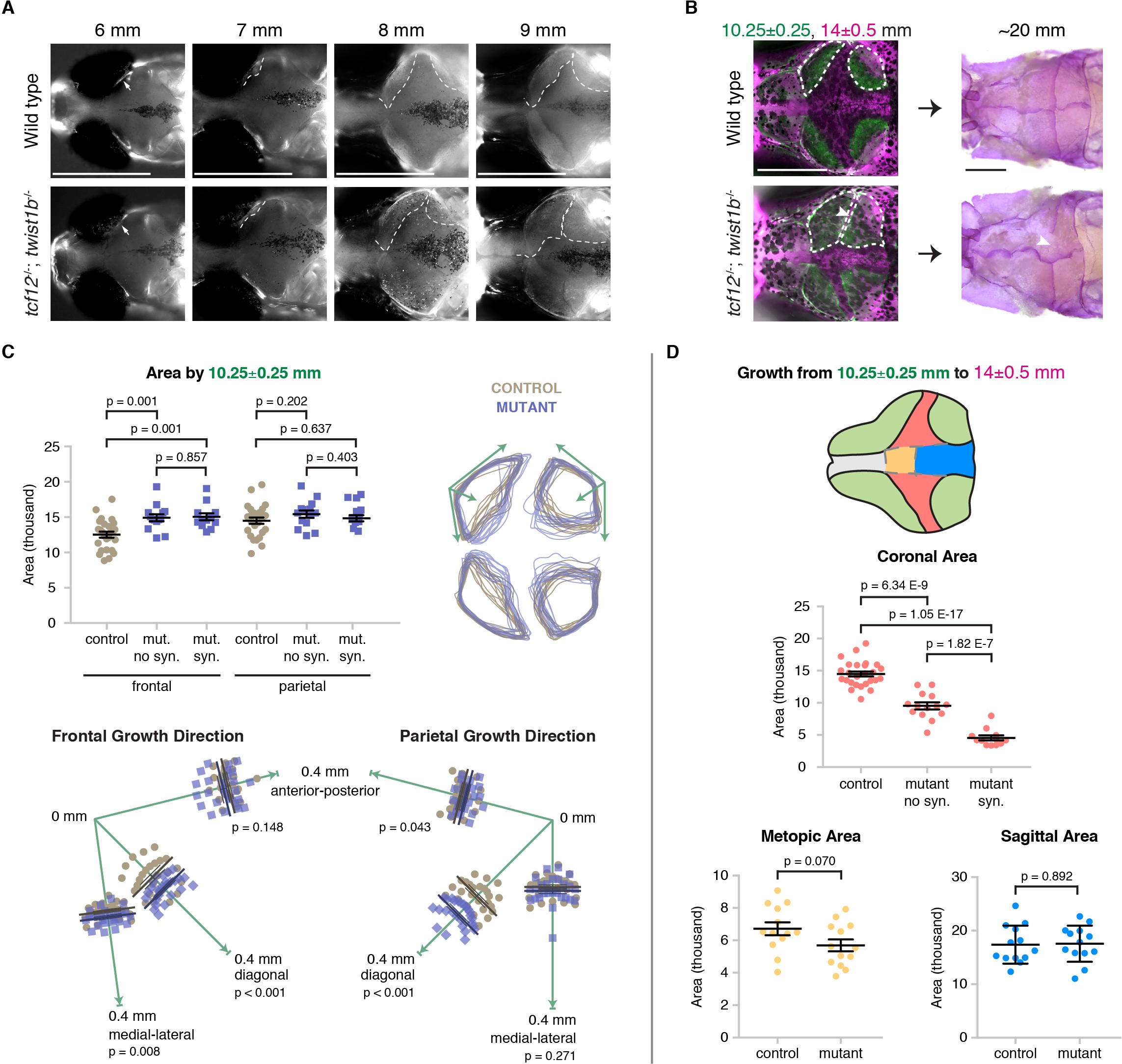 (A) Dorsal views of the developing skull bones in the same wild-type and mutant individuals across four developmental stages. Live fish were stained with Calcein Green at 6, 7, and 8 mm and Alizarin Red at 9 mm. For the right sides, arrows show initiation of the frontal bone at 6 mm and dashed lines show the frontal (left) and parietal (right) fronts at successive later stages. (B) Individual wild-type and tcf12; twist1b mutant fish were stained with Calcein Green at 10.25 ± 0.25 mm, recovered, and then stained again with Alizarin Red and imaged at 14 ± 0.5 mm. These same fish were then grown to 20 mm, at which stage they were fixed and stained again with Alizarin Red to assess suture patency. White dotted lines indicate bone generated by 10.25 mm. Arrowheads indicate missing coronal suture. Scale bars, 1 mm. (C) Quantification of calvarial bone growth. Bone produced by 10.25 ± 0.25 mm was calculated based on the area (µm) stained with Calcein Green (white outlines in B). At 10.25 mm, compared to control frontal bones (n = 12), tcf12; twist1b mutant frontal bones that developed synostosis later (n = 11) and those that did not (n = 11) showed similar increases in bone formation. Bone shape was assessed by overlaying tracings of posterior frontal bones and parietal bones for wild types and mutants. Specific growth directionality in the anterior-posterior, medial-lateral, and diagonal axes were measured and quantified (green arrows). (D) Bone growth from 10.25 ± 0.25 mm to 14 ± 0.5 mm was analyzed in respect to prospective suture zones. Growth in the metopic (yellow) and sagittal (blue) zones did not differ significantly in controls versus tcf12; twist1b mutants, which correlated with no defects in these sutures in mutants. In contrast, growth in the coronal zone was reduced in tcf12; twist1b mutants, with a more pronounced decrease in mutant sides that later developed synostosis. p values were determined by Student’s t-tests; error bars represent standard error of the mean.