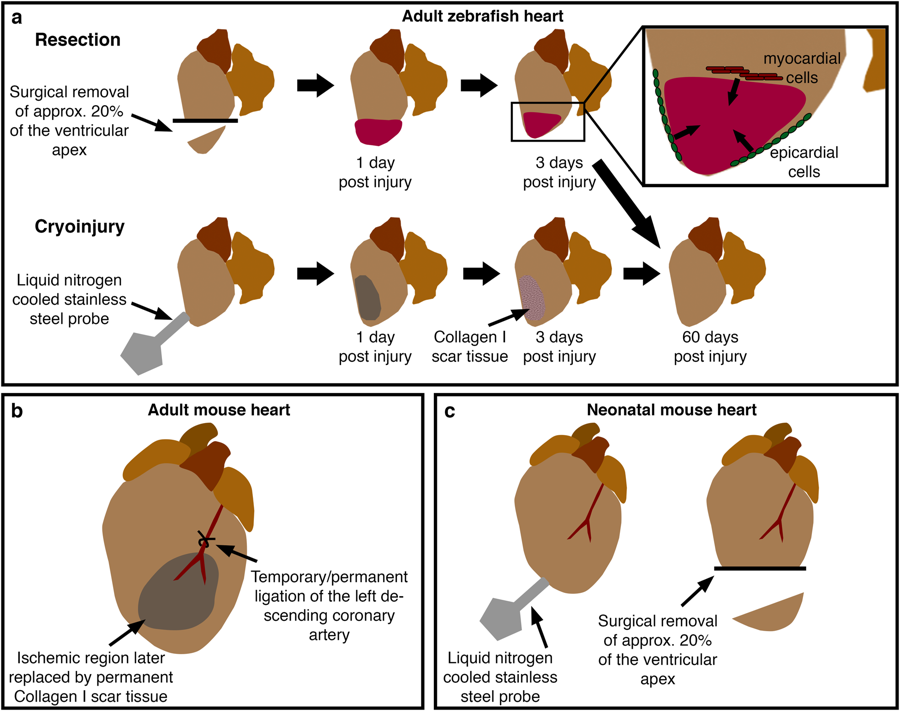 Fig. 4 Models of cardiac damage in adult and neonatal vertebrates. a Current methods to induce cardiac damage in adult zebrafish include resection, involving the surgical removal of around 20% of the apex of the ventricle, and cryoinjury where a liquid nitrogen-cooled probe is pressed onto the surface of the ventricle, resulting in cell death and transient scarring. These injury models elicit similar modes of healing involving contributions from de-differentiated epicardial and myocardial cells (inset). b In adult rodents, cardiac injury is usually induced by ligation of the left descending coronary artery. Temporary ligation allows investigation of the effects of reperfusion injury. c Recent reports have described similar injury models to adult zebrafish in neonatal mice eliciting similar cellular responses