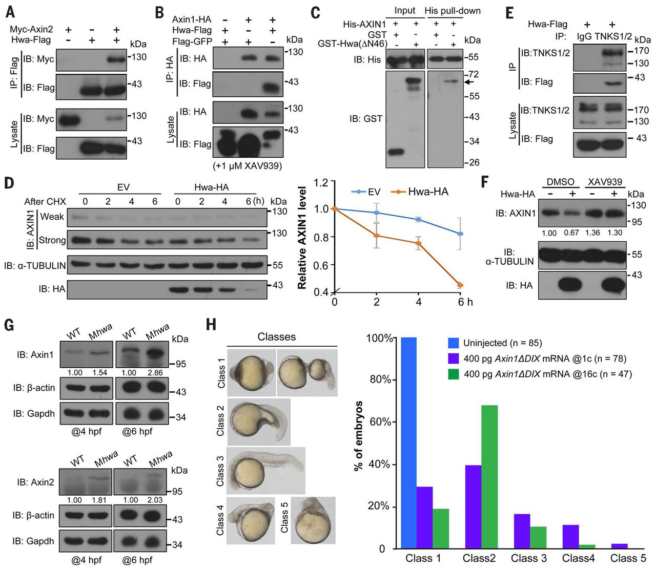 Fig. 7 Hwa binds to and promotes the degradation of Axin. (A and B) Hwa-Flag physically interacts with Myc-Axin2 (A) and Axin1-HA (B) in HEK293T cells. Zebrafish Hwa and mouse Axin1 and Axin2 were used. XAV939 is a tankyrase inhibitor. Note that Axin1 and Axin2 levels are reduced when zebrafish Hwa is expressed. (C) Direct binding of Hwa with AXIN1. His-AXIN1 (N351) protein of human AXIN1 origin was incubated with GST-Hwa(ΔΝ46) protein of zebrafish origin expressed in E. coli. GST-Hwa (indicated by an arrow) is detected by Western blotting in the His-AXIN1 precipitates. (D) Hwa-HA promotes degradation of endogenous AXIN1 in HEK293T cells. Left: Cells transfected with empty vector (EV) or Hwa-HA were treated with cycloheximide (CHX; 100 μg/ml) and harvested for immunoblotting at indicated time points. Right: Dynamic change of AXIN1 protein level (normalized to α-TUBULIN), shown as mean ± SD. (E) Hwa-Flag binds to endogenous TNKS1/2 in HEK293T cells. (F) Hwa-promoted degradation of endogenous AXIN1 in HEK293T cells is prevented by inhibition of tankyrases. Six hours after transfection, cells were treated with DMSO or 1 μM XAV939 for 18 hours. Relative AXIN1 levels (normalized to α-TUBULIN) are indicated. (G) Immunoblotting reveals an increase of endogenous Axin1 and Axin2 proteins in Mhwatsu01sm mutants at 4 and 6 hpf. Relative levels are indicated. (H) Axin1ΔDIX overexpression rescues the body axes of Mhwatsu01sm mutants. Axin1ΔDIX mRNA was injected into one-cell stage mutants or into one blastomere of 16-cell stage mutants. Embryos at 24 hpf were categorized into five classes (left) and the ratio of embryos in each class is shown (right).