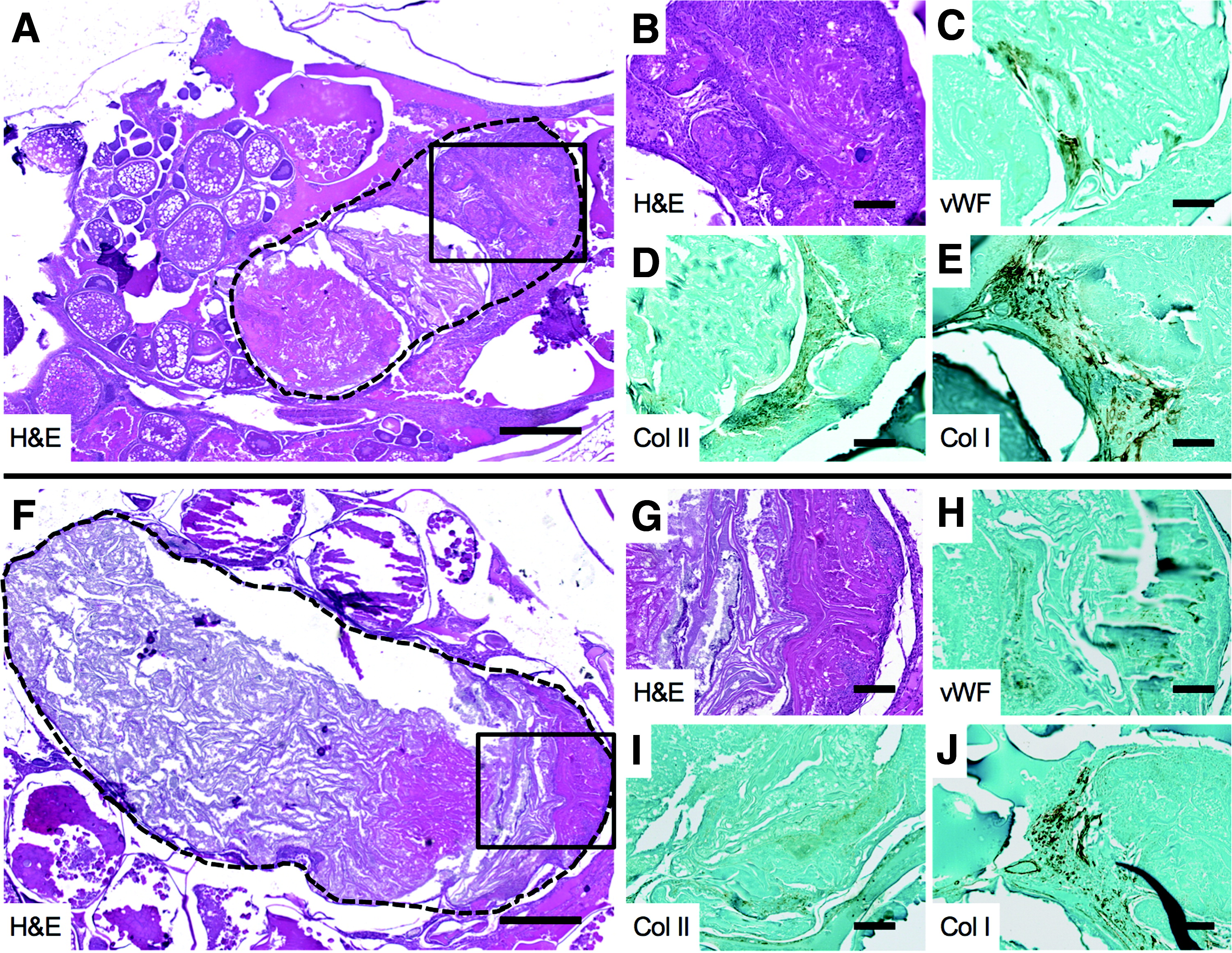 Fig. 7 Cartilage and bone formation in body cavity HO in Acvr1lQ204D-expressing zebrafish. HO lesions in tail fin clip-injured HS Tg(Bre:GFP); Tg(acvr1l_Q204D-mCherry) zebrafish at 2 wpi, paraffin sectioned and H&E stained (A, B, F, G), and analyzed by IHC for vWF (C, H), Col II (D, I), and Col I (E, J). The HO lesion is outlined with a dashed line(A, F). (B, G) Enlarged views of boxed areas in (A, F), respectively. (A, F) 5 × scale bar is 40 μm. (B–E, G–J) 20 × scale bar is 100 μm. Col I, collagen I; Col II, collagen II; vWF, von Willebrand factor.