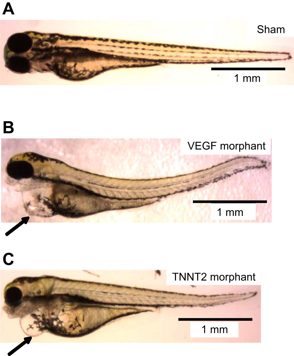 Representative microscopy images of sham (A), VEGF morphant (B), and cardiac troponin T (TNNT2; C) morphant zebrafish larvae at 4 days postfertilization (dpf). Black arrows indicate pericardial edema; scale bars represent 1 mm.