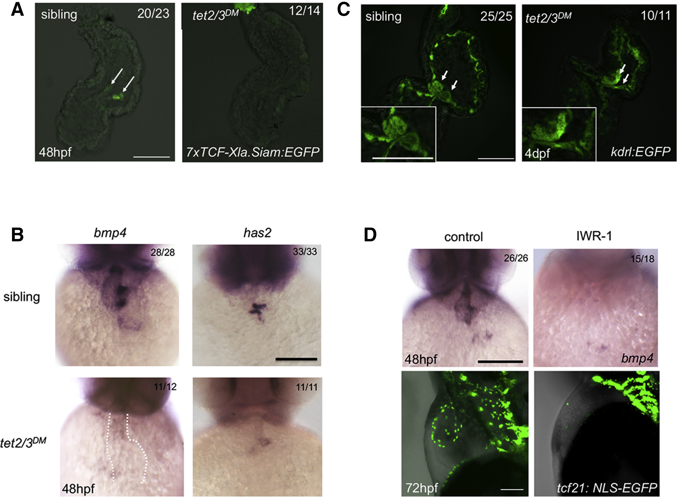 (A) GFP-labeled AVC endocardium represents Wnt activity in sibling heart, but not tet2/3DM heart. Hearts were dissected from 48-hpf larvae carrying the Tg(7xTCF-Xla.Siam:GFP) transgene. White arrows indicate AVC endocardial cells with Wnt activity.