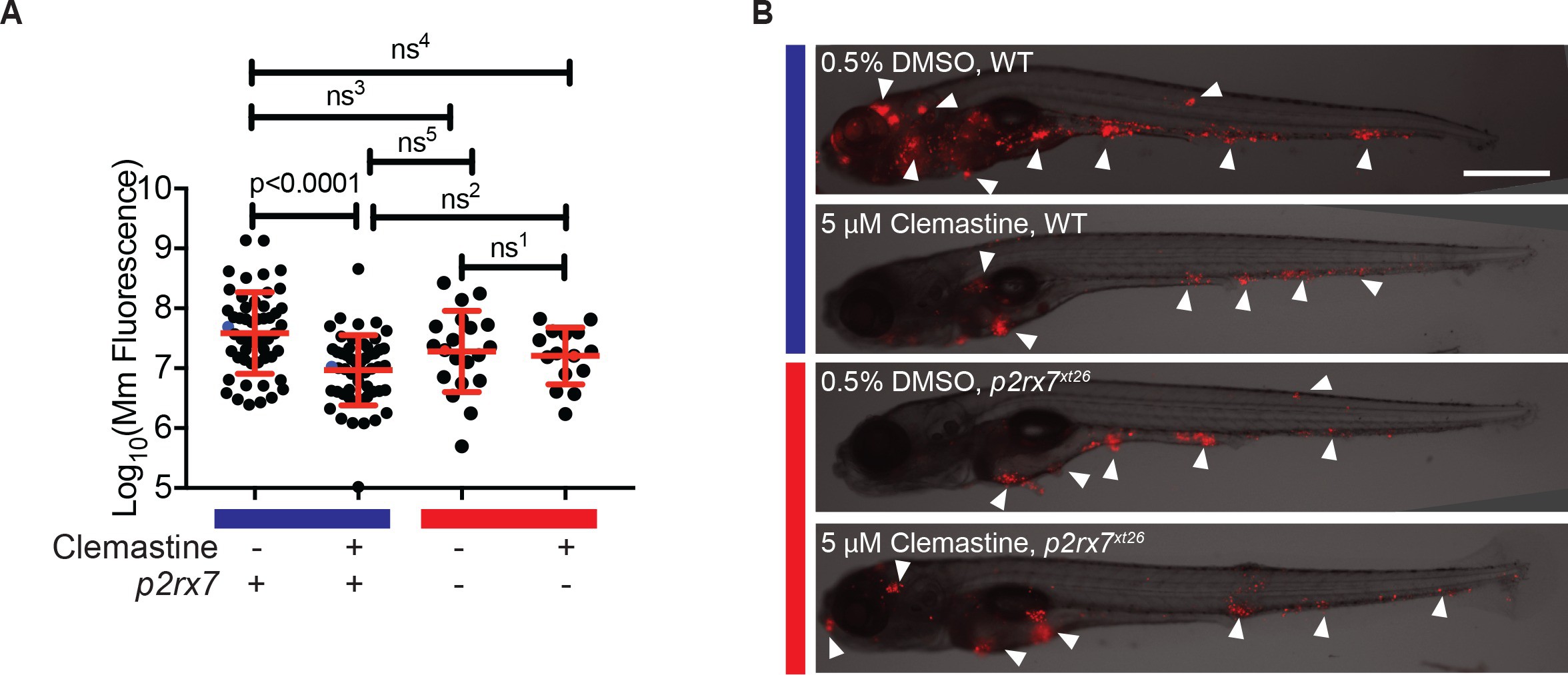 (A) Schematic of P2rx7 receptor, based on human structure, with CRISPR target site in exon 10 denoted with a star. (B) CRISPR/Cas9-mediated lesions in p2rx7 include a five base pair deletion (p2rx7xt26) and a two base pair deletion (p2rx7xt28) leading to a premature stop codon in exon 10. Red bar denotes p2rx7 mutants and blue bar denotes WT animals. (C) Quantification of calcium flashes observed with light-sheet microscopy in Tg(mfap4:GCaMP6F)xt25 and p2rx7xt26;Tg(mfap4:GCaMP6F)xt25 infected with ~ 50 CFU Mm:tdTomato. Each dot represents the number of flashes observed in a single infected macrophage in an animal during a 30-min time-course during treatment with 0.5% DMSO or 5 µM clemastine, 4–5 hpi, n > 3 fish for each group. All cells counted were visibly infected with Mm:tdTomato and scoring performed blind to genotype or treatment. (D) Representative calcium transient. Panels are stills from a light-sheet video in an untreated Tg(mfap4:GCaMP6F)xt25 animal infected with Mm:tdTomato. Scale bar is 25 µm. (C) Kruskal-Wallis ANOVA for unequal variances, Dunn’s multiple comparison test. ns1 > 0.9999, ns2 = 0.7007 All error bars are s.d.; p values from statistical tests on untransformed data are provided in Supplementary file 2.