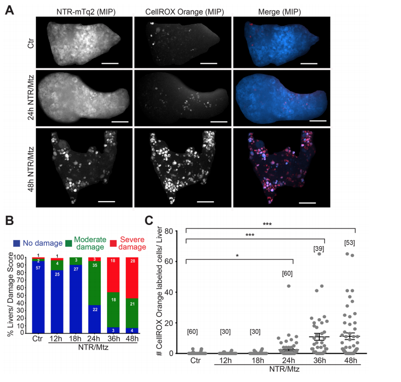 NTR/Mtz-induced liver damage is associated with oxidative stress. (A) Representative maximum intensity projections (MIP) of 8 dpf TG(fabp10:NTR-mTq2; casper) zebrafish livers exposed to Mtz for 24 h or 48 h. Cyan, NTR-mTq2. Red, CellROX oxidative stress dye. Scale bars, 50 µm (B) Quantification of morphological phenotypes by damage score. Numbers within bars indicate number of animals per group. (C) Quantification of CellROX live stain. Square brackets, number of animals per condition. Error bars, SEM. *t-test p < 0.05. ***t-test p < 0.0005.
