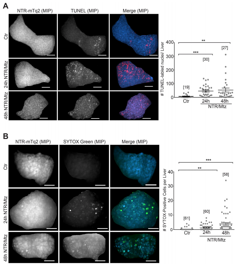 NTR/Mtz primarily induces apoptosis and sporadic necrosis. (A) Left panel: Representative maximum intensity projections (MIP) of zebrafish livers stained for apoptotic DNA (TUNEL) after 24 h and 48 h of Mtz exposure. Cyan, NTR-mTq2. Red, TUNEL labeling. Scale bars, 50 μm. Right panel: Quantification of TUNEL staining. Square brackets, number of animals per condition. Error bars, SEM. **t-test p < 0.005. ***t-test p < 0.0005. (B) Left Panel: Representative confocal maximum intensity projections (MIP) of livers stained for necrotic cells with SYTOX Green after 24 h and 48 h of Mtz exposure. Cyan, NTR-mTq2. Green, SYTOX Green. Scale bars, 50 µm. Right Panel: Quantification of SYTOX Green staining. Square brackets, number of animals per condition. Error bars, SEM. **t-test p < 0.005. ***t-test p < 0.0005.