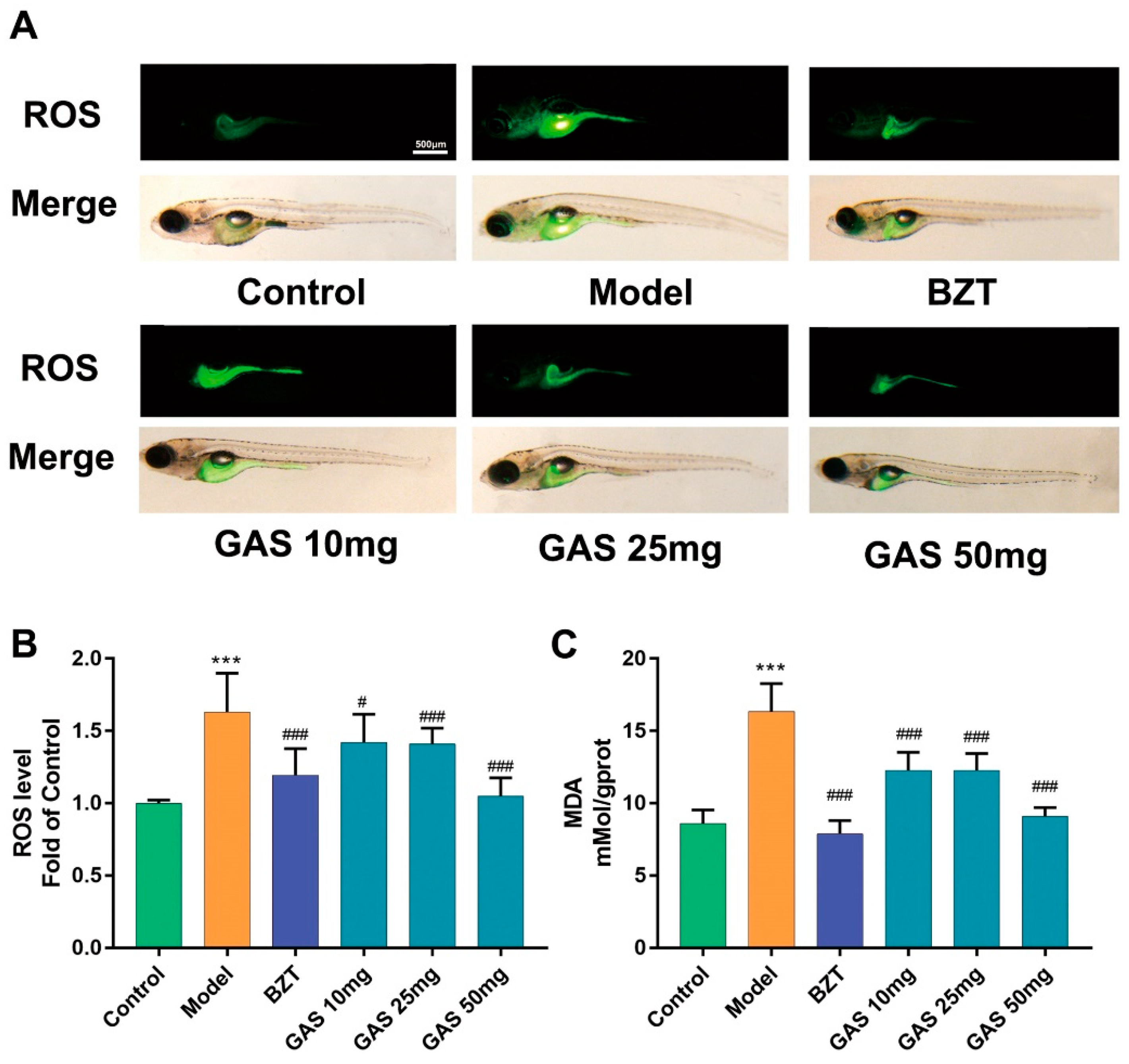 The anti-oxidant stress effect of GAS on HCD induced larval zebrafish. (A) The ROS production showed in fluorescence image and merged with a light field image. (B,C) Quantitation of reactive oxygen species C malondialdehyde (ROS. C. MDA) of each treated larval zebrafish group. Bar indicate means ± SD. *** p < 0.001 represent compared with the control. # p < 0.05, ### p < 0.001 represent compared with Model. p < 0.05 was considered as statistically significant, as calculated by One-way ANOVA followed by Tukey’s test. (n = 30).